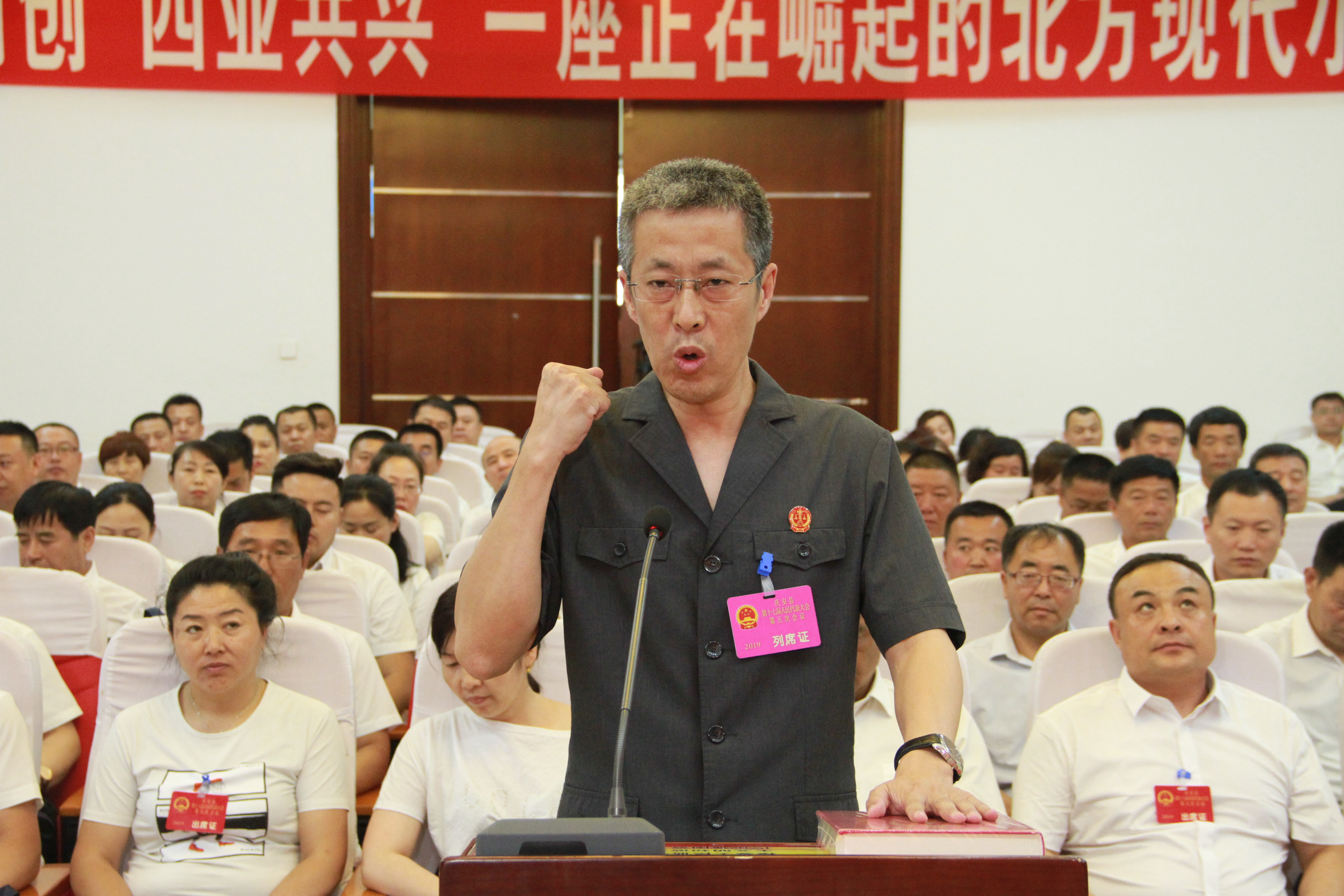 孙宏辉手抚《中华人民共和国宪法》庄严宣誓,句句铿锵有力,字字掷地有声,誓言响彻会场。