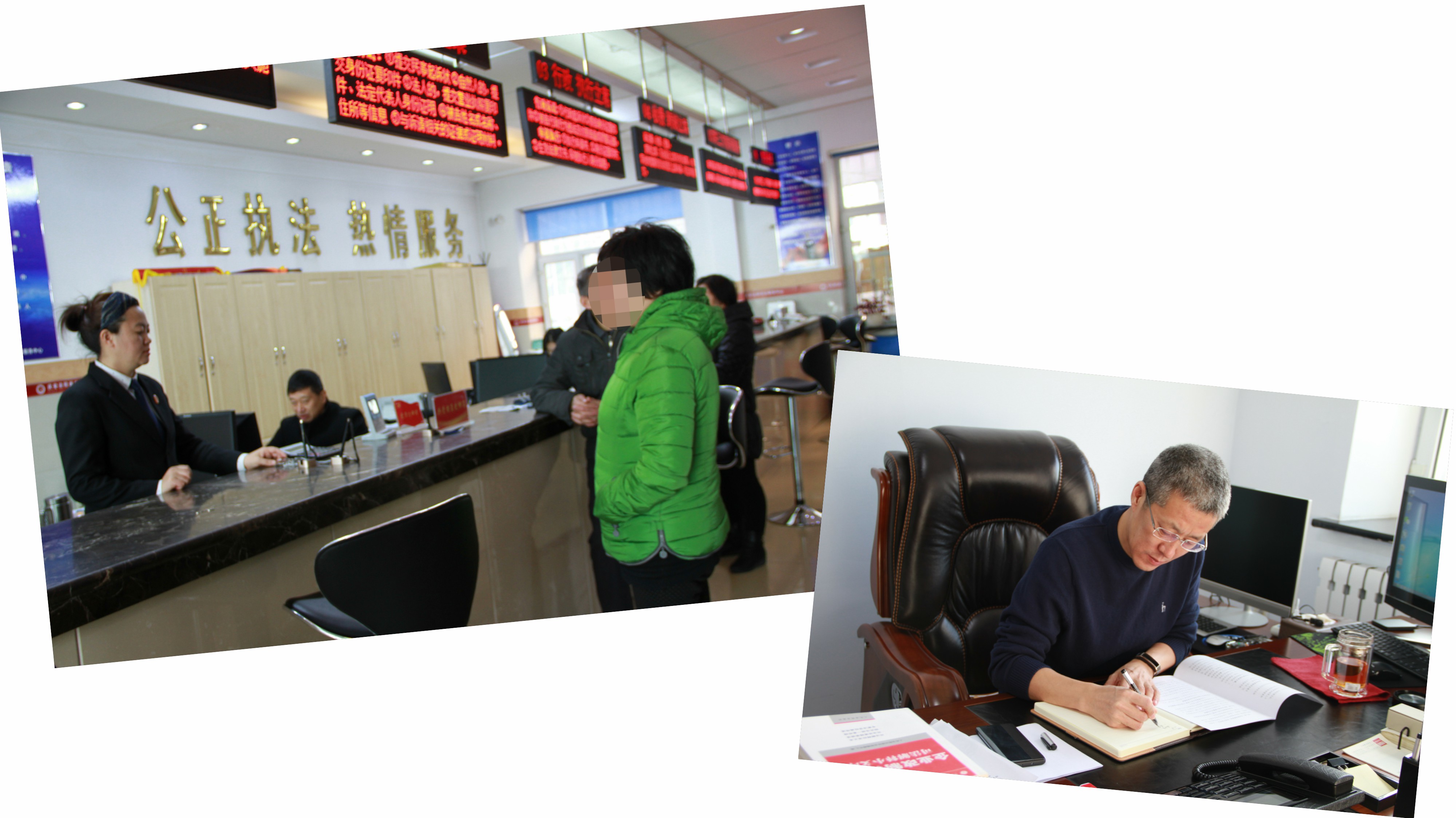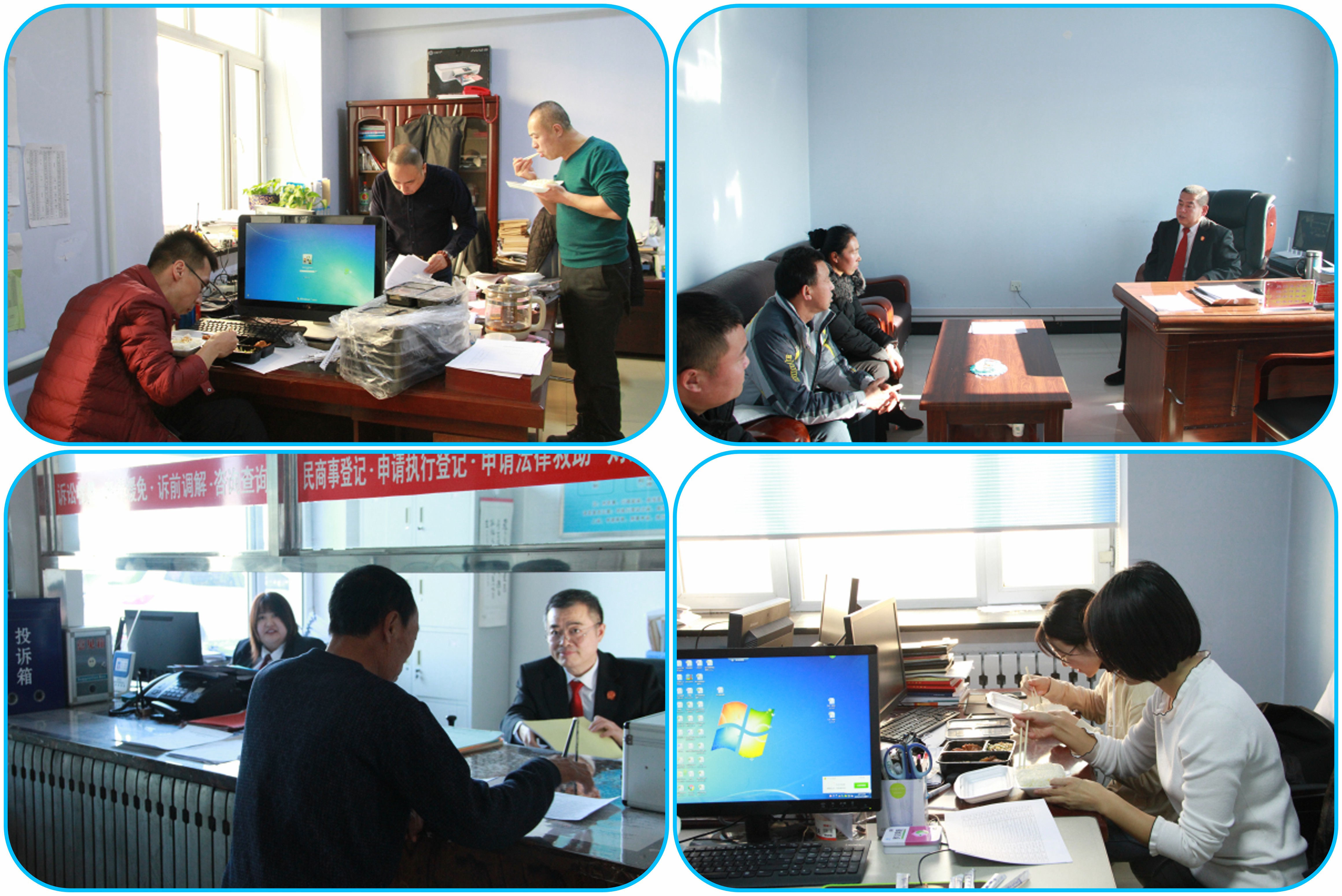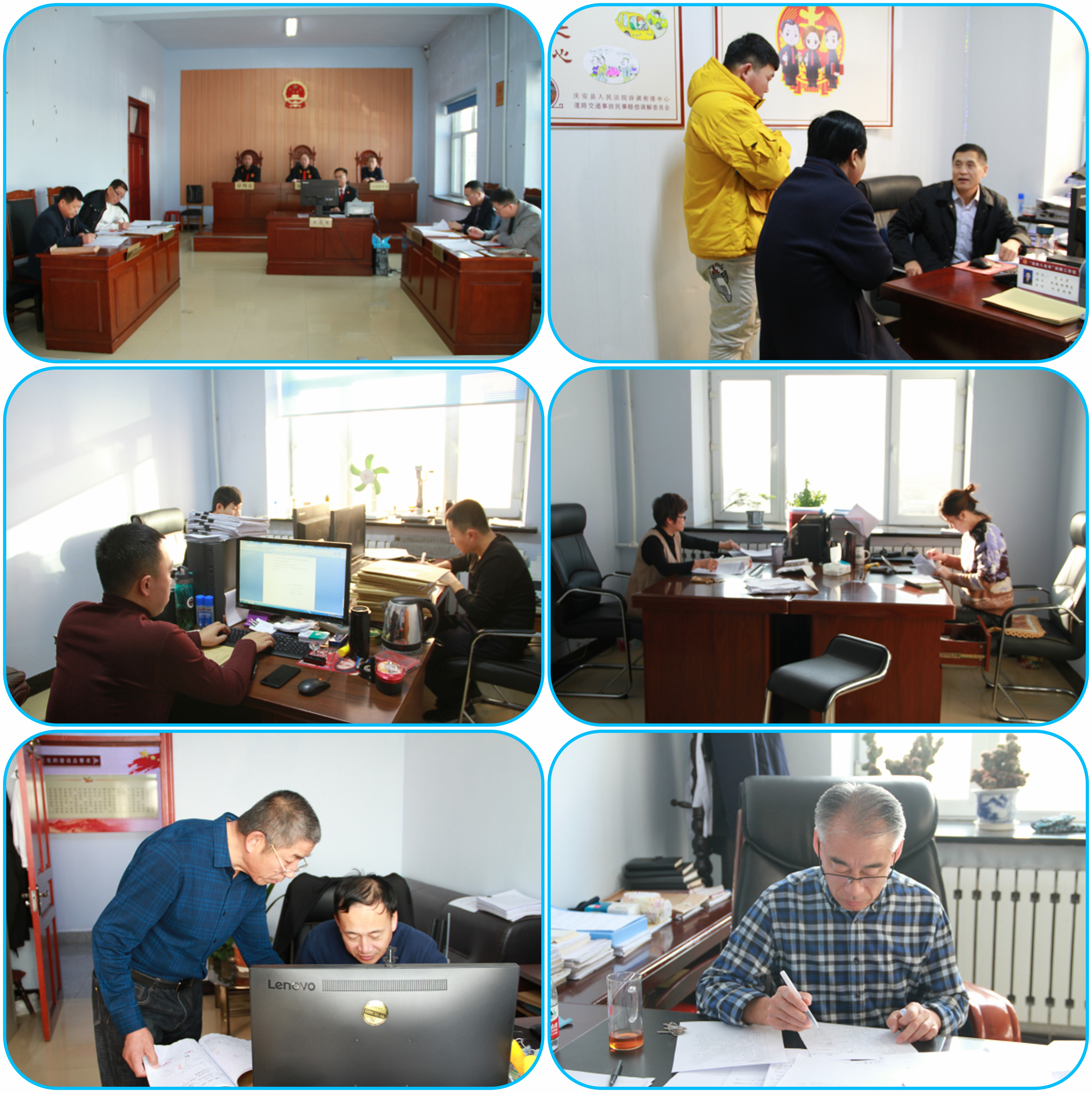 走进庆安法院你就会看到,干劲十足的干警们或在讨论案件、或在起草文书、或在开庭审案、或在进行调解,干警们高涨的热情仿佛抵御了冬日的严寒。时至傍晚,法院办公楼依然灯火通明,到处都是忙碌的身影。卷宗翻阅的沙沙声、键盘鼠标的敲打声,以及略显急促的脚步声,如同优美音符一般汇聚成了一曲别样的交响乐,演绎着新时代的“工匠精神”。他们所付出的辛勤汗水早已经凝铸在一本本卷宗当中,显现在一个个当事人满意的微笑里。饭时到了,这里没有饕餮大餐,有的只是简单的盒饭;李作亮、杨赞斌、隋长玉、苏文富等等,这些人都已年过半百、“三高”缠身,到了即将退休的年龄,但他们仍就坚守在办案第一线,默默的耕耘,为年轻法官们照亮了前行的路。