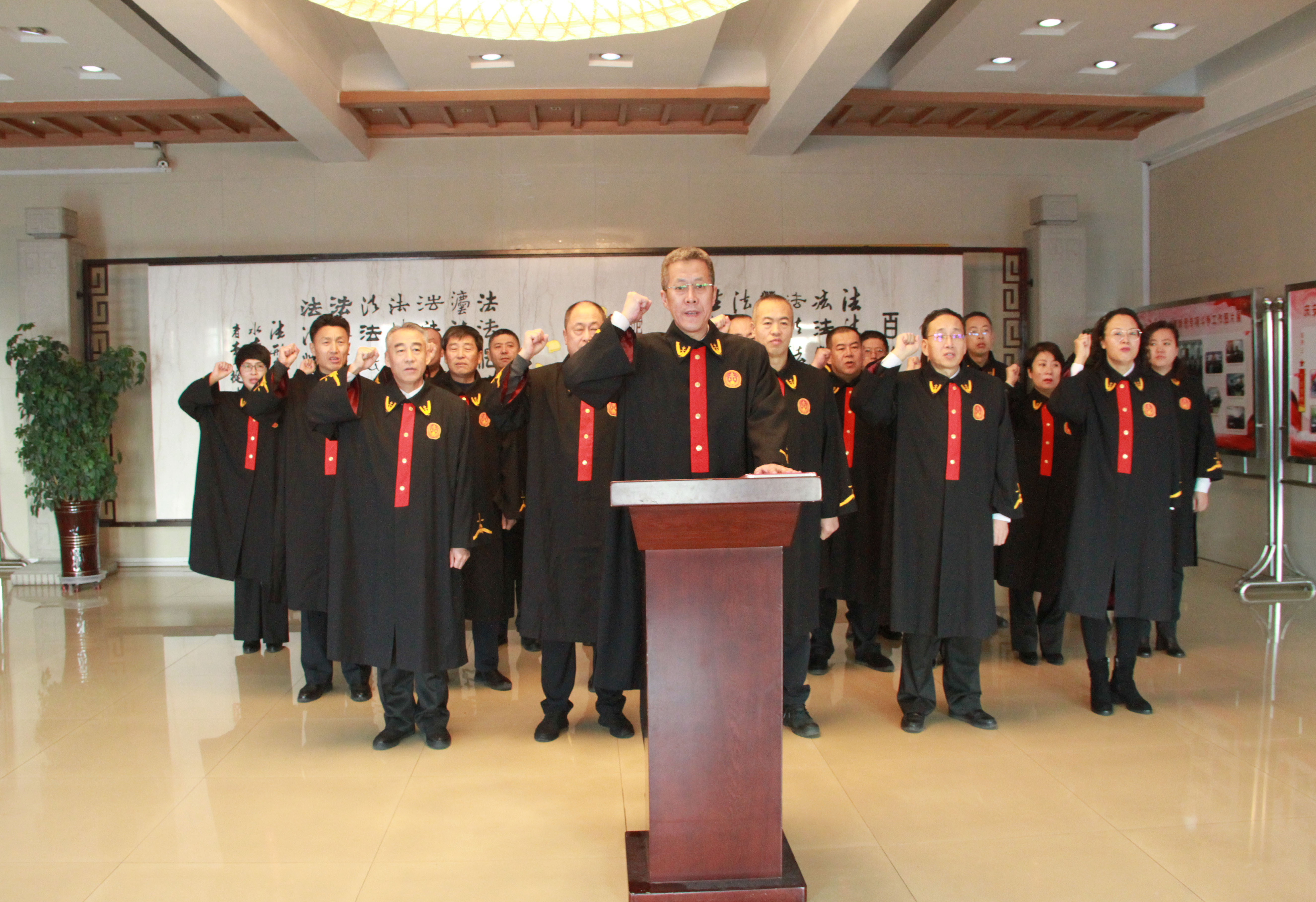 8:40时,党组书记、院长孙宏辉手抚《中华人民共和国宪法》,右手举拳,庄严领誓。全体员额法官在领誓人的带领下,身着法袍整齐列队,面对国旗,紧握右拳,庄严宣誓。