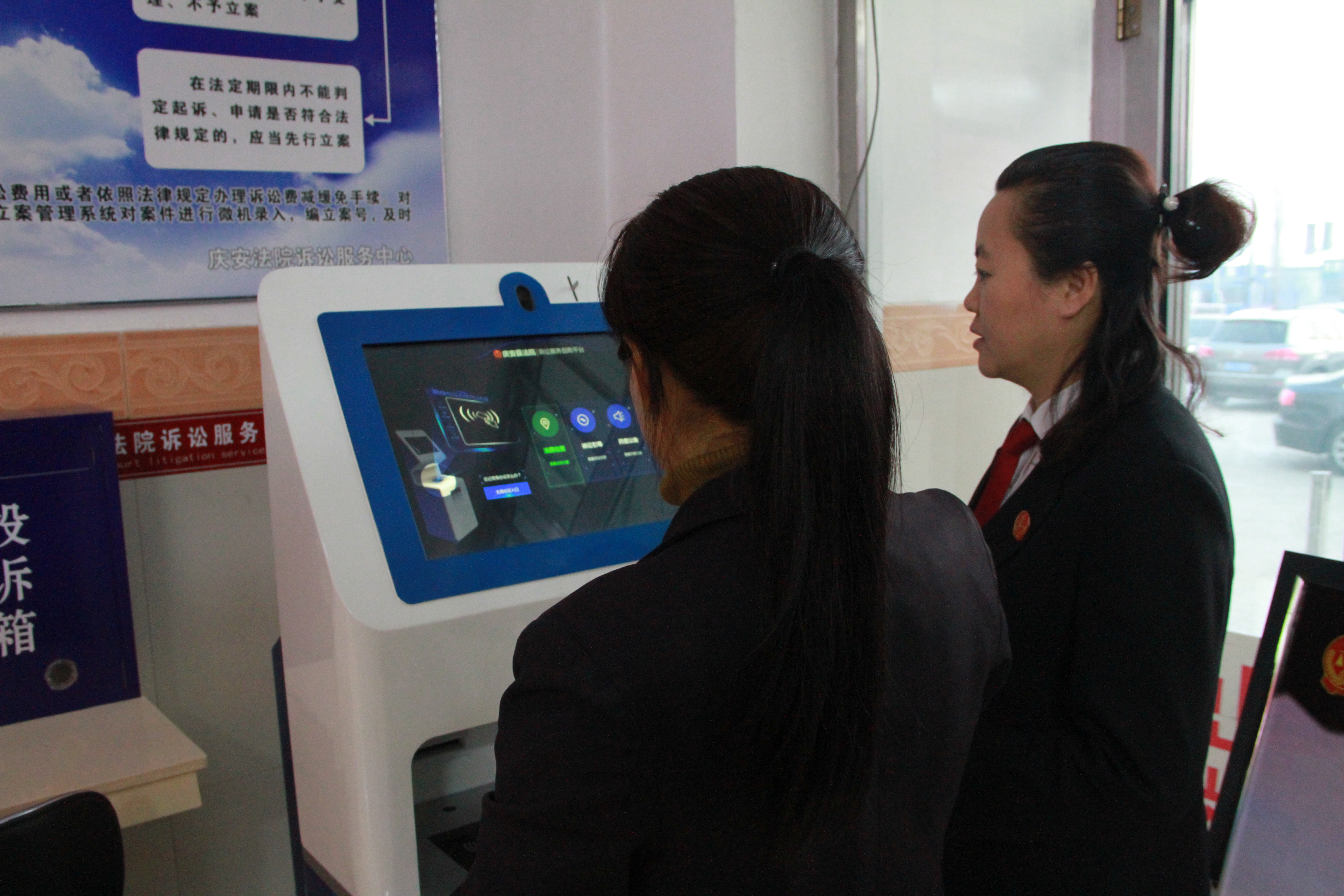 “庆安法院这个诉讼服务终端设备真不错,不需要排队,你们指导,我操作,才几分钟案子就立好了,真方便!”在尝试“自助立案”后,案件当事人张女士连声称赞。