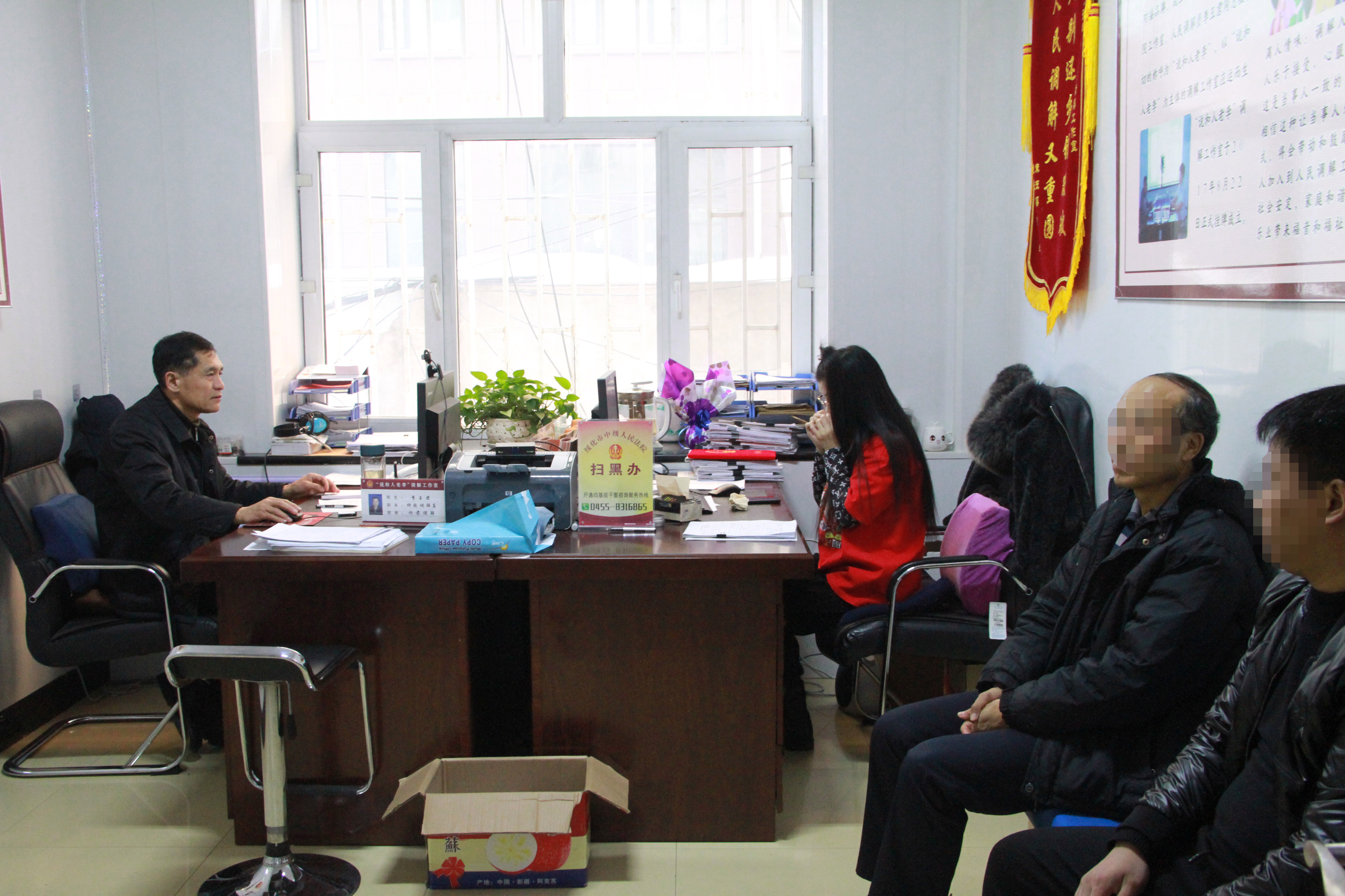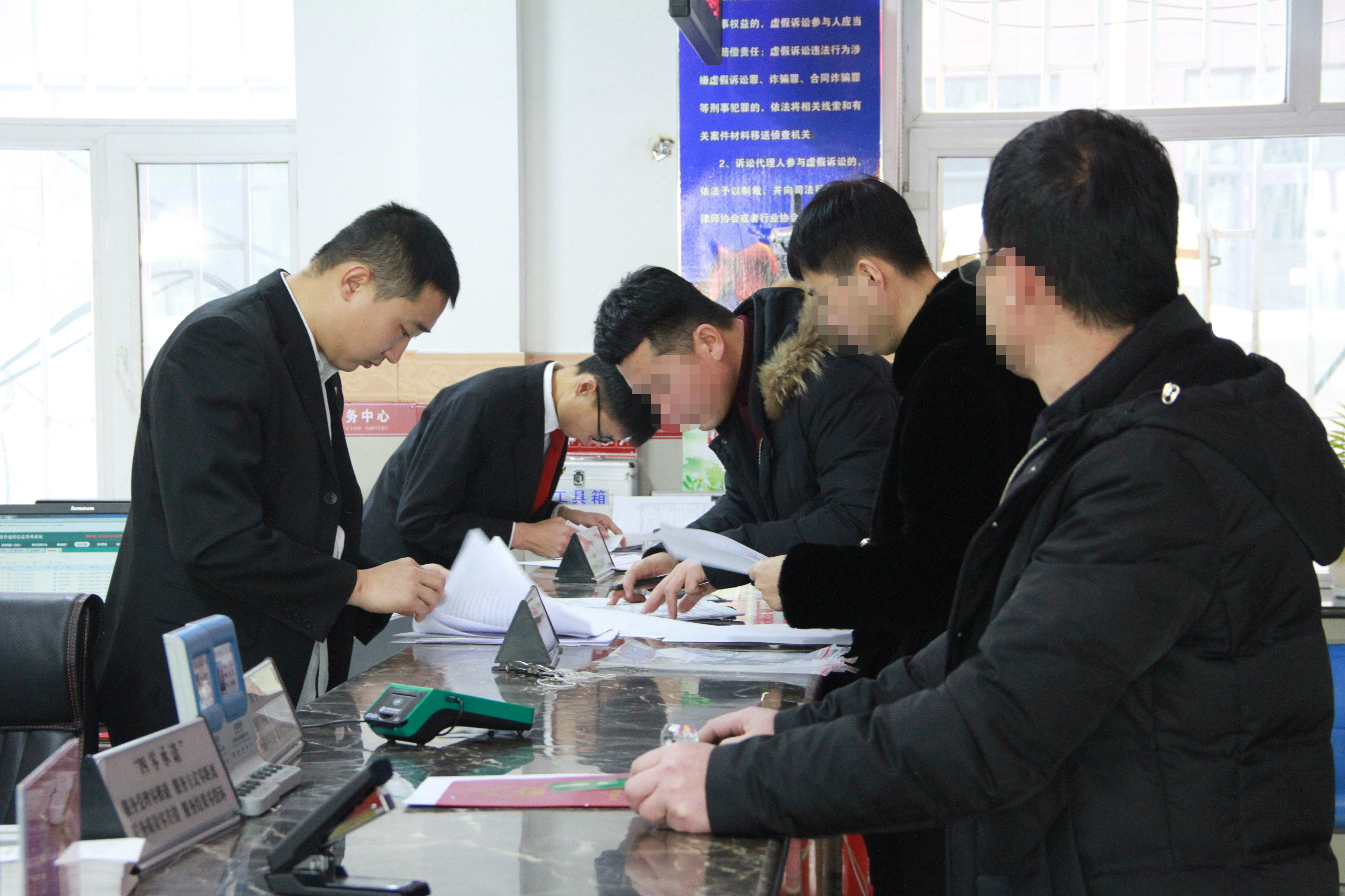 尽管已经12点多了,各个窗口还有未离开的群众。面对一张张期盼、焦虑的面孔,干警们深感责任重大,依旧严谨地查看着当事人递交的材料,倾听着当事人的诉求,有条不紊地登记每一起案件,并一次性告知当事人需要补充的材料。他们坚持以热情、高效的服务理念,做好每一起案件的诉讼指导、立案登记等工作,最高一天接待当事人825人次,没有一位干警有怨言,没使一位当事人不满意,庆安法院诉讼服务中心的工作得到了当事人一致好评。
