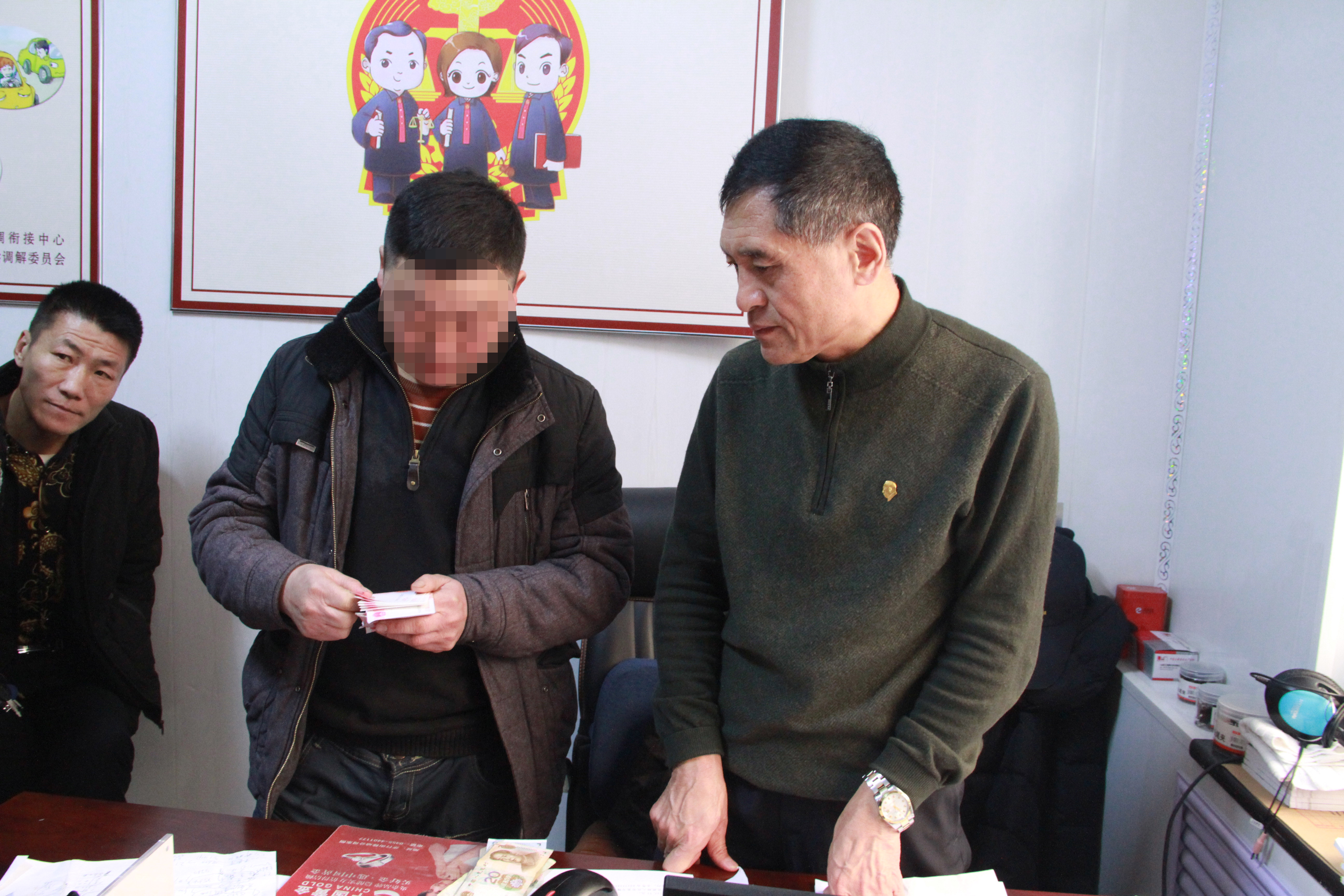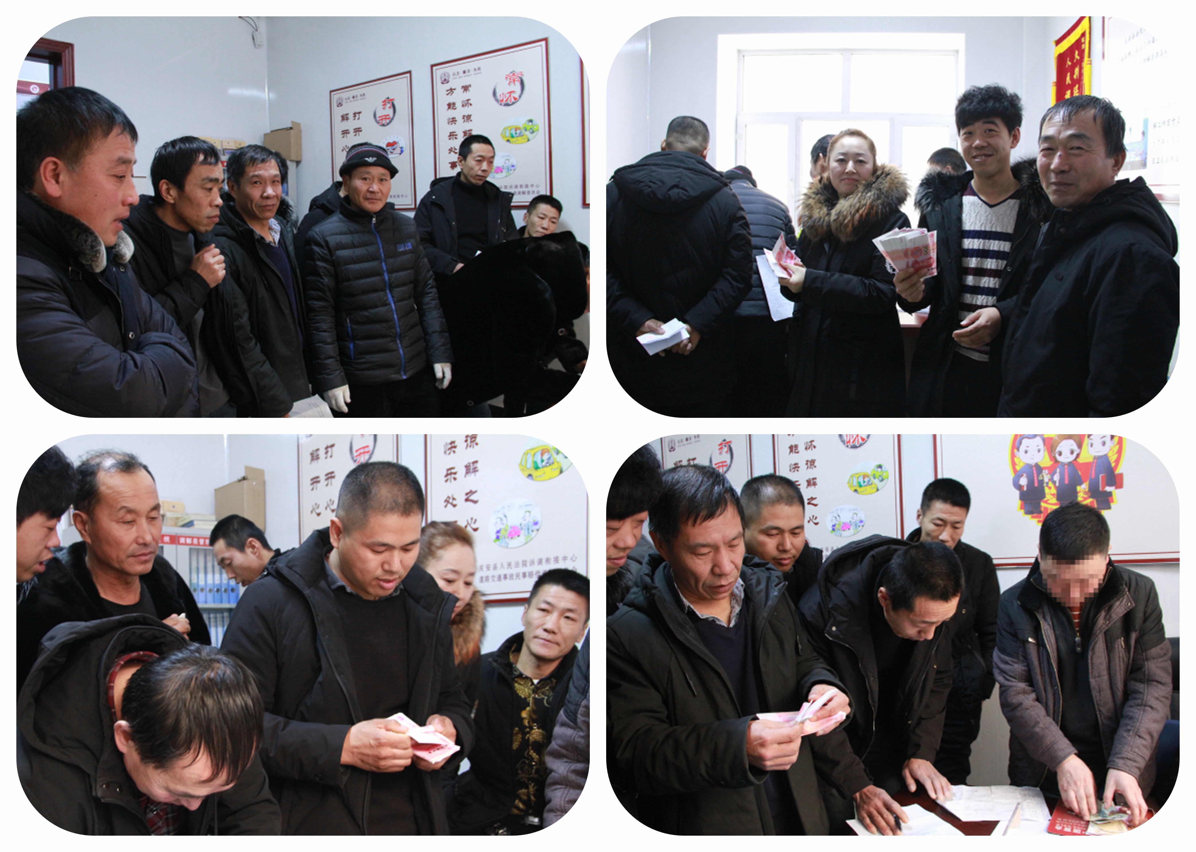 1月14日,庆安法院“老李调解工作室”一派喜气洋洋的欢乐景象, 12名农民工手里攥着工资款脸上洋溢着喜悦的笑容。原来,在“说和人老李”的调解下,成功为农民工讨回了“血汗钱”。