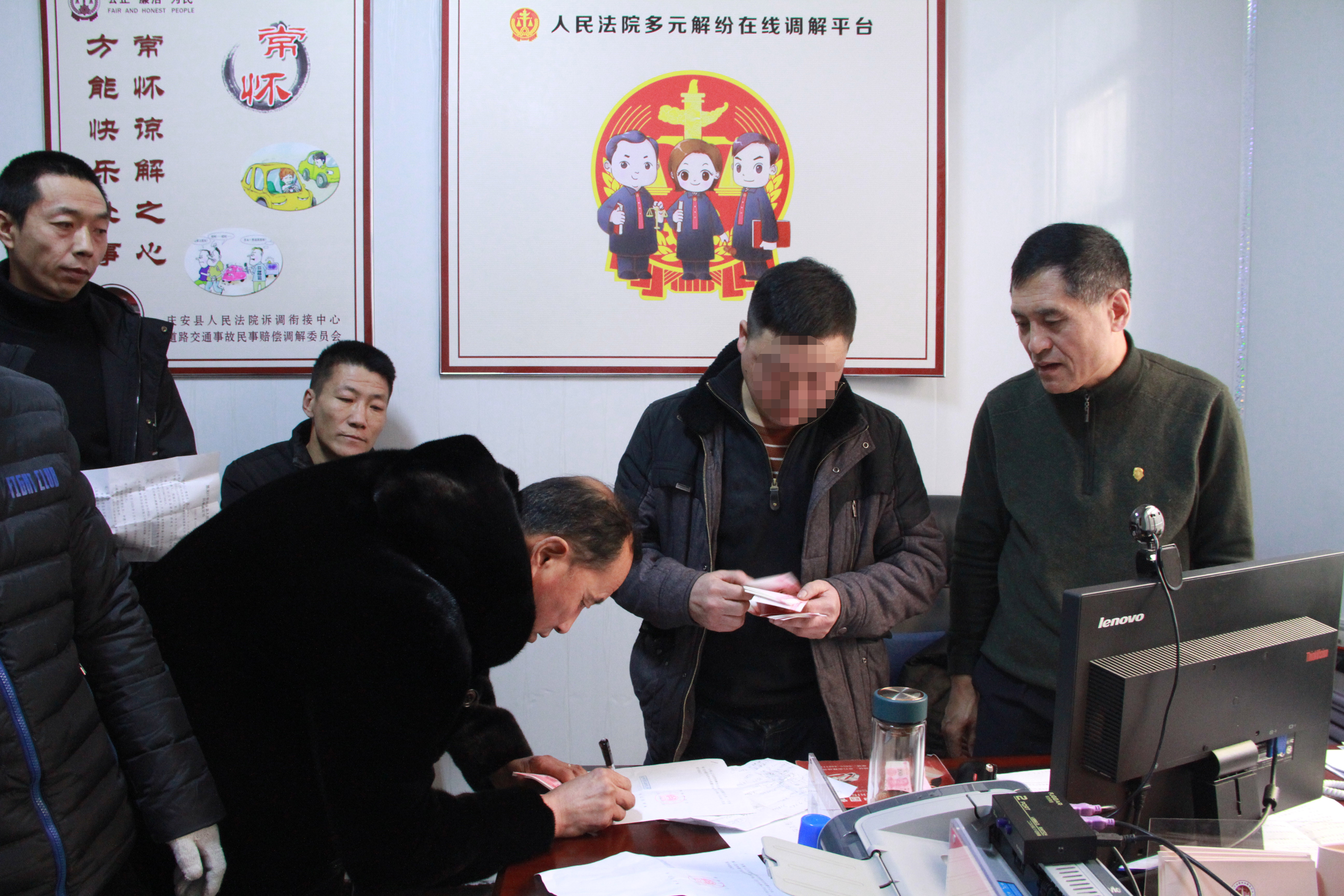 2017年6月,刘国坤(化名)等12人在唐明意(化名)开发的房地产工地打工,约定了工资并签订了合同。工程结束后,唐明意一拖再拖,一晃两年过去了,始终不发工钱。马上要过年了,12个农民工再次向唐明意索要工钱,被唐明意以各种理由推拖,最后拒绝与农民工见面。无奈之下,刘国坤等人来到法院,希望通过法律手段讨回工资。因案件涉及农民工群体权益,“老李”受案后立即找来开发商唐明意,首先对他释法明理,从情与法上耐心分析其存在的过错和要承担的法律责任,并让其“换位思考”,从对方角度考虑问题,理解农民工的生活处境和心理状态。同时,也对12名农民工做耐心的劝解和心理疏导工作,缓和双方矛盾。最终,在“老李”动之以情、晓之以理的耐心调解下,双方达成调解协议,唐明意一次性给付12位农民工工资共计68000元,并在“老李”的主持下,对着名单给大家一一发放工资。工钱终于到手了,可以回家过年了,农民工的脸上都露出欣喜的笑容。