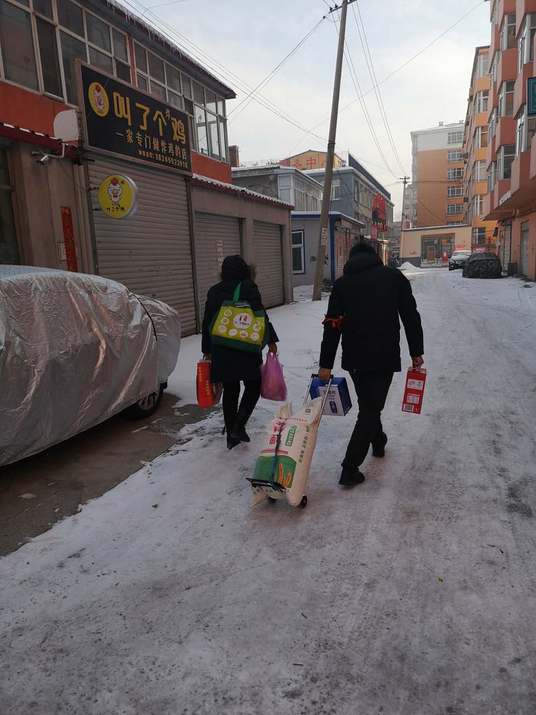 在8号执勤卡点,一位老人吃力地拖着多种生活用品蹒跚而来,执勤干警刘昌钊见状主动上前帮助老人运送至家中。原来,老人响应管控政策,已多日居家未出,此次出门采购了大量的米、面、牛奶等生活物资。老人对法院干警的热情相助非常感动,连连称谢。
