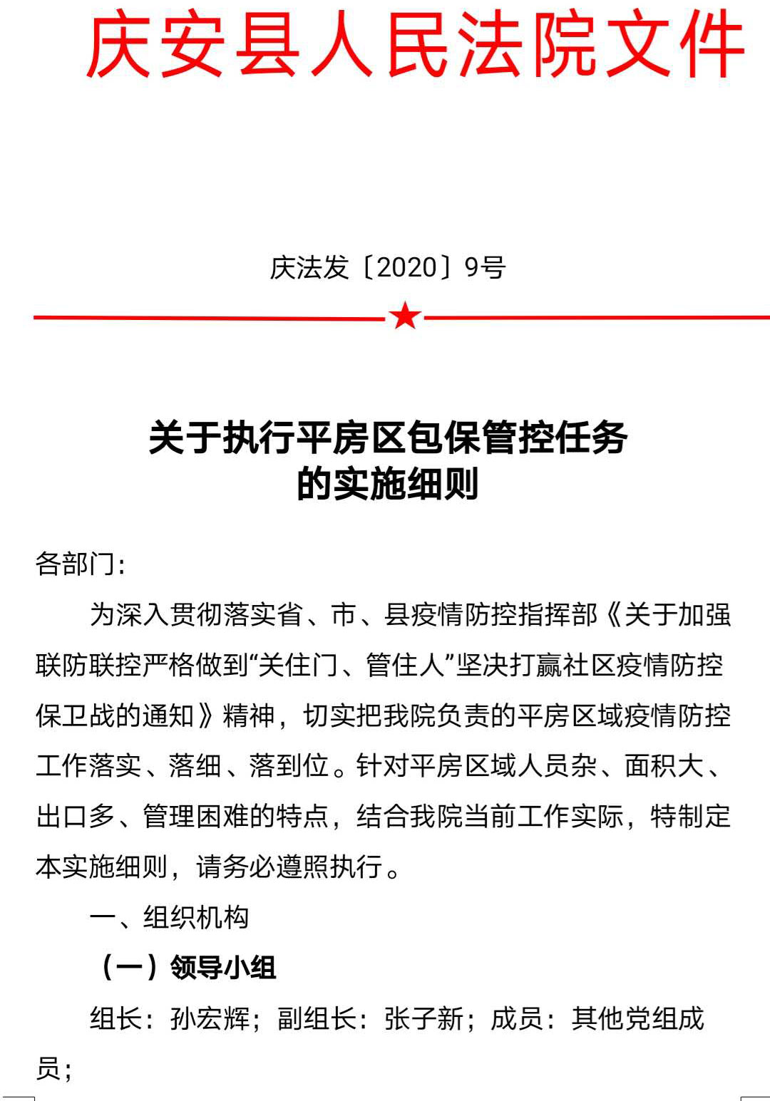 新型冠状病毒肺炎疫情爆发以来,庆安法院严格执行中央、省市县委和上级法院关于疫情防控工作的相关部署,成立疫情防控工作指挥部,制定工作方案、突发应急预案,在重新调整管控区后,又及时根据实际情况制定下发相关制度规定,并严格贯彻执行,确保了疫情防控工作制度化、规范化。