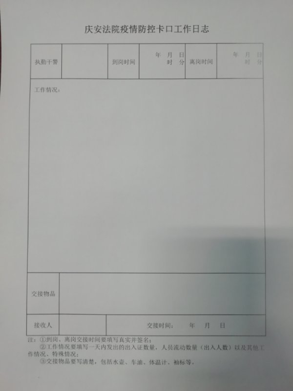2月16日,按照县委管控区域调整的部署要求,庆安法院负责一大片开放式平房区域管控。针对这一区域人员杂、面积大、出口多、管理难的特点,庆安法院以视频的方式召开党组(扩大)会议,传达县委文件精神,研究部署新的防控工作任务。结合近几日管控工作实际情况,制定并下发了《庆安县人民法院关于执行平房区包保管控任务的实施细则》,确保认识到位、人员到位、组织到位、工作到位、责任到位,进一步厘清带班领导、防控执勤、后勤保障、纪检督察、宣传报道的工作职责范围,规范了防控工作程序方法,提出了明确要求,并按照县委相关要求印制了《庆安县人民法院疫情防控卡口工作日志》,印发了《居民出入信息登记表》,要求各卡点执勤干警严格按照要求规范填写,每天进行督导检查。