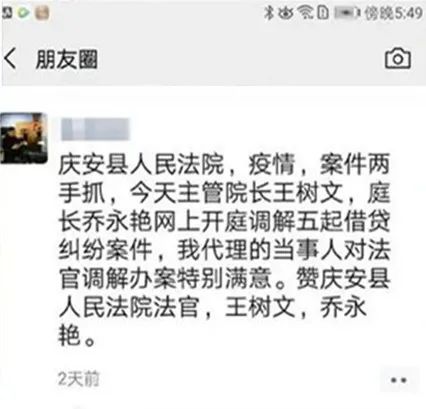 这种简便易行规范有序的在线调解得到当事人认可和好评,原告代理人将庆安县法院线上调解案件做法发到了朋友圈,得到朋友纷纷点赞。