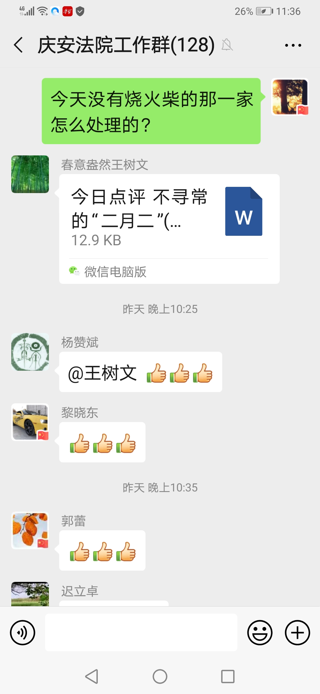 这是一篇庆安法院每天代班领导例行的工作点评,在庆安法院工作群里面点评一天工作。