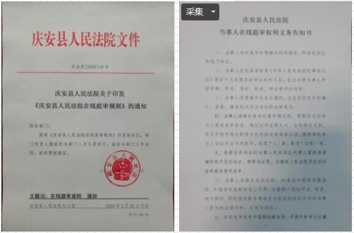 根据《通知》精神,庆安法院研究制定了《庆安县人民法院在线庭审规则》《庆安县人民法院当事人在线庭审权利义务告知书》等一系列适合本院工作实际的线上诉讼操作规程,认真组织办案法官积极开展线上诉讼活动。通过在制度上的规范、在组织上的保障,以及院级领导率先垂范、院庭长带头线上办案,线上诉讼工作近期已初见成效。