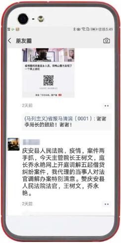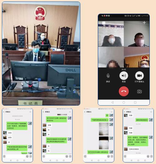 2月21日,庆安法院党组成员、副院长王树文在一方当事人不会利用微法院的情况下,征得双方当事人、代理人同意后,同原告委托诉讼代理人张某和被告周某、姜某以微信视频在线群聊方式对他们的借贷纠纷进行线上调解。在调解前向当事人告知在线诉讼的权利和义务,明确了是否同意在线调解和在线调解的法律效力。经过疫情当前双方要互谅互让、共担风险、共渡难关的劝解,原被告双方最终达成调解协议。当天,民事审判庭庭长乔永艳以同样的方式视频调解成功5件民间借贷纠纷案件。