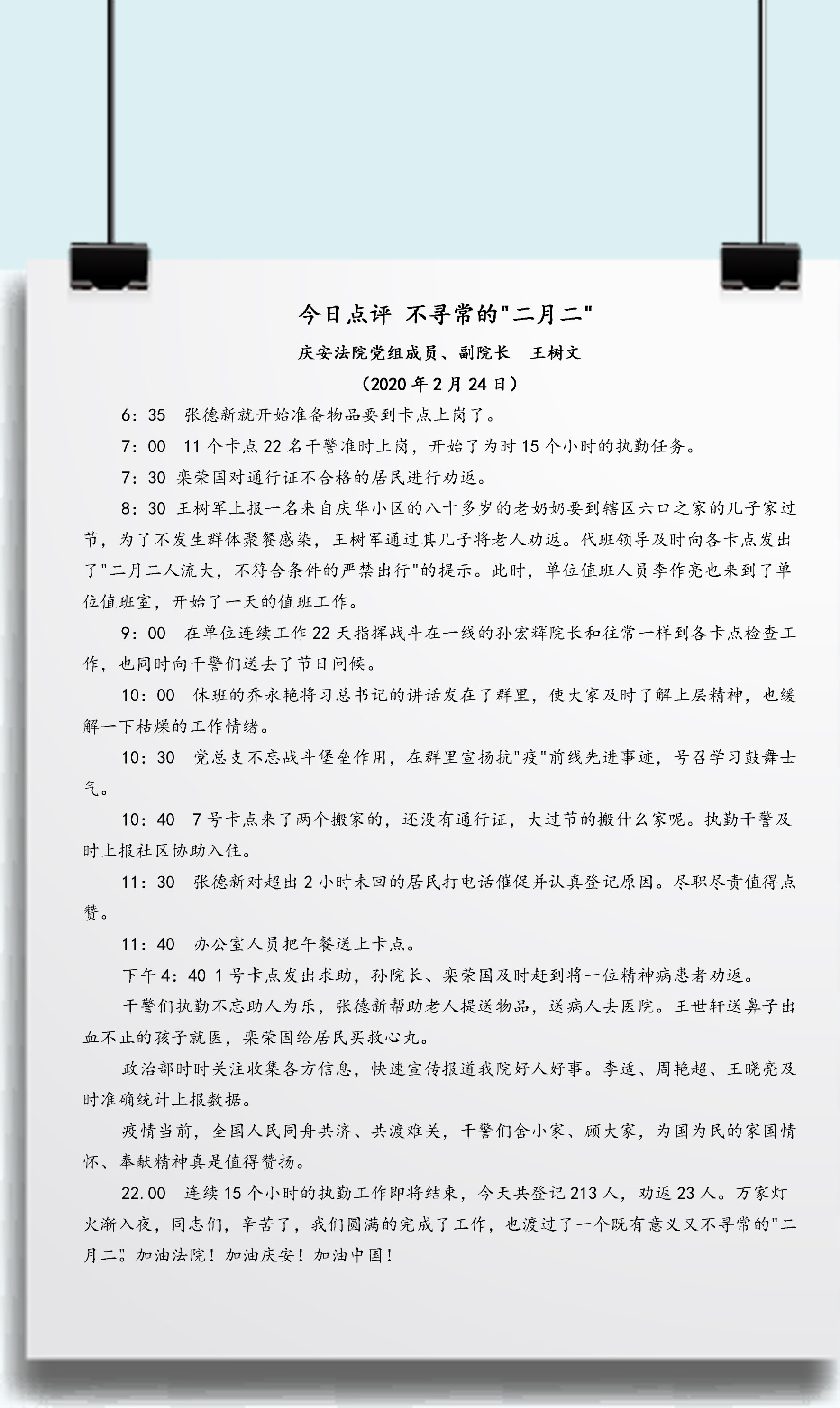 根据抗疫工作部署,庆安法院每天都由一名党组成员带班负责院机关的值班值宿、防控卡点的指挥、指导、检查,一天的工作任务结束后,带班领导都会将当天工作进行总结点评,并以工作日志形式发到工作群中。然而,就是这一则则小小的工作日志,却引发了全体干警及全县干部群众的关注和热议,并持续“发酵”。这究竟是怎么回事呢?这些工作日志到底有着怎样的特殊之处,又为何能引发关注和热议?让我们来看一看它的庐山真面目。
