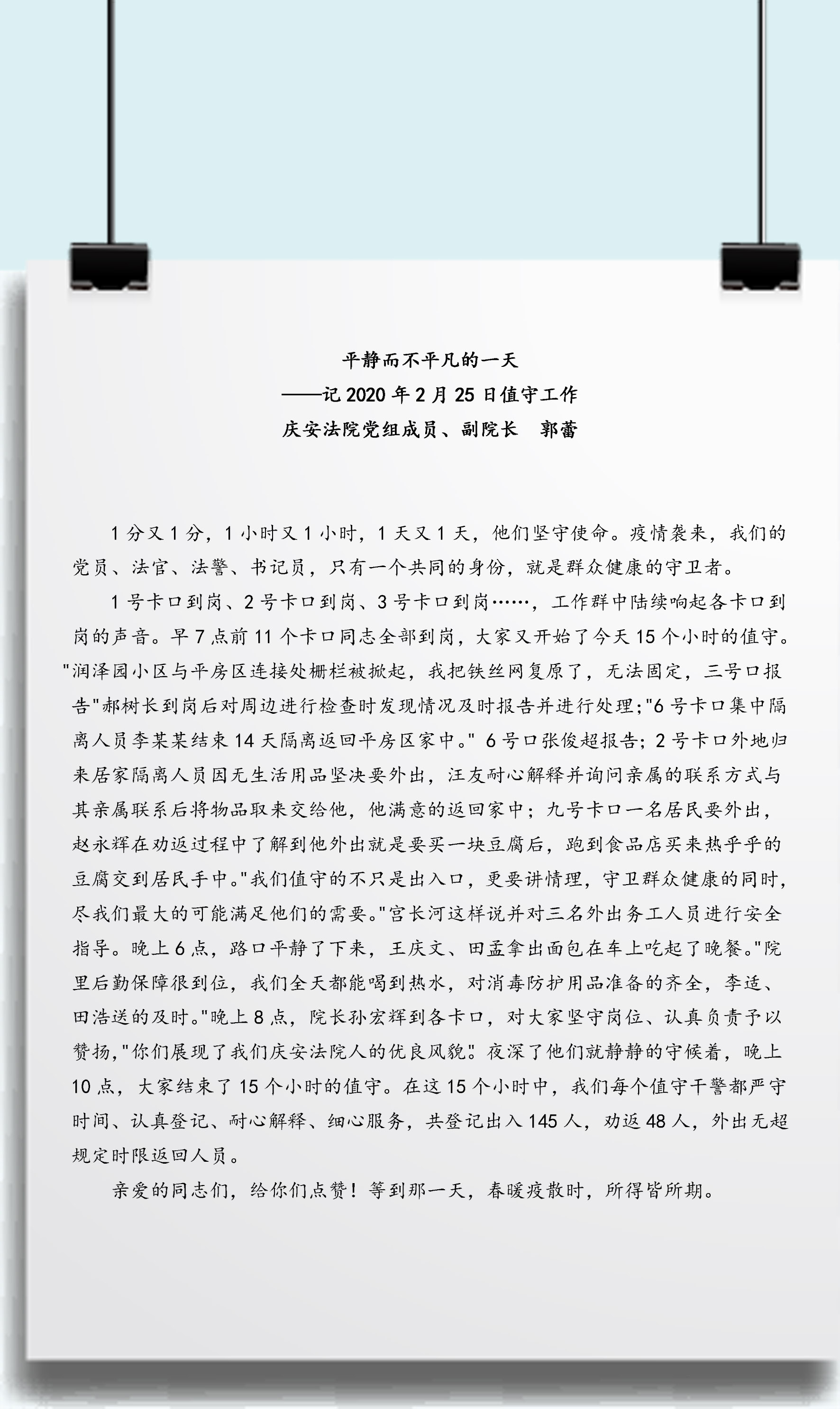 今年恰逄我们国家决战全面建成小康社会、实现“十三五”规划的收官之年,打赢这场突如其来的抗击疫情攻坚战显然具有十分重要的战略意义。让我们牢记总书记的嘱托,在党中央坚强领导下,紧紧依靠人民群众,发扬庆安法院带班领导那种默默无闻、任劳任怨和钉钉子的精神,最终赢得这场大考,坚决打赢疫情防控人民战争、总体战、阻击战,努力实现决胜全面建成小康社会、决战脱贫攻坚目标任务,向人民、向历史交上一份合格的答卷!