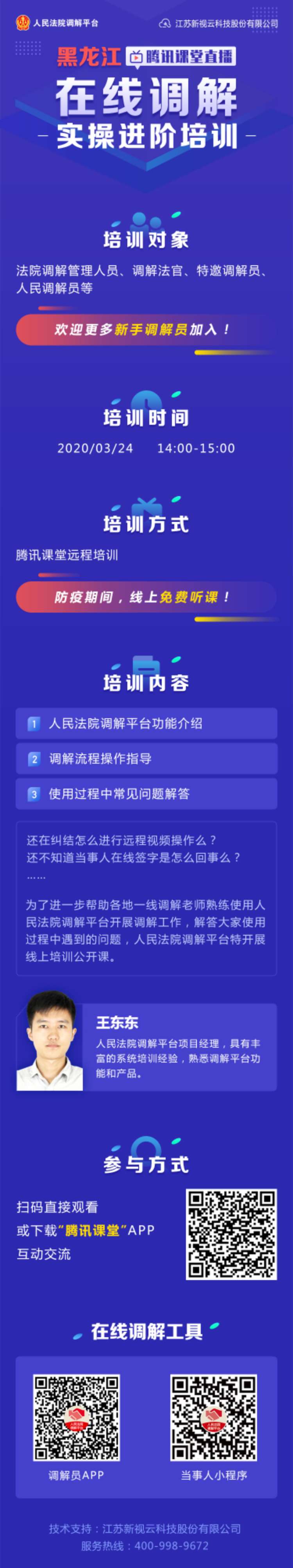 此次培训由人民法院调解平台项目经理王东东主讲,对调解平台功能、调解流程操作、使用过程中常见问题等进行了详细解读。