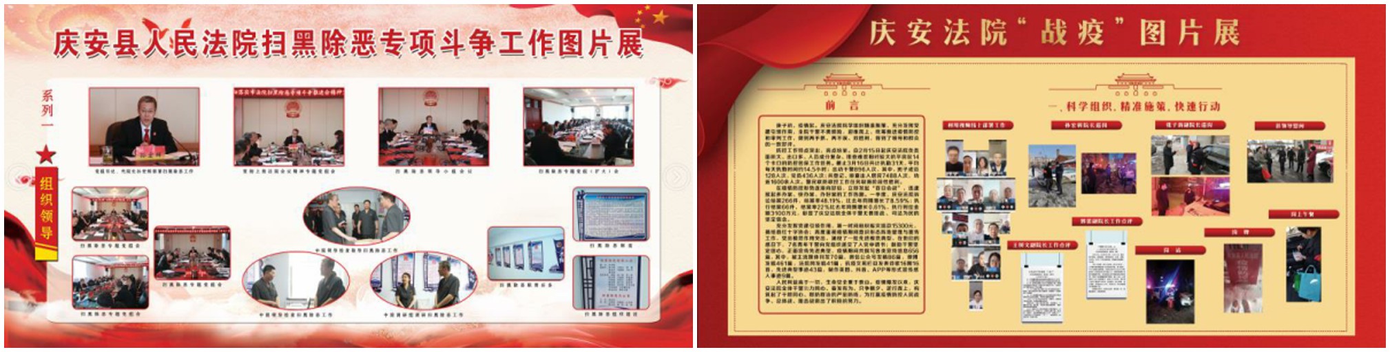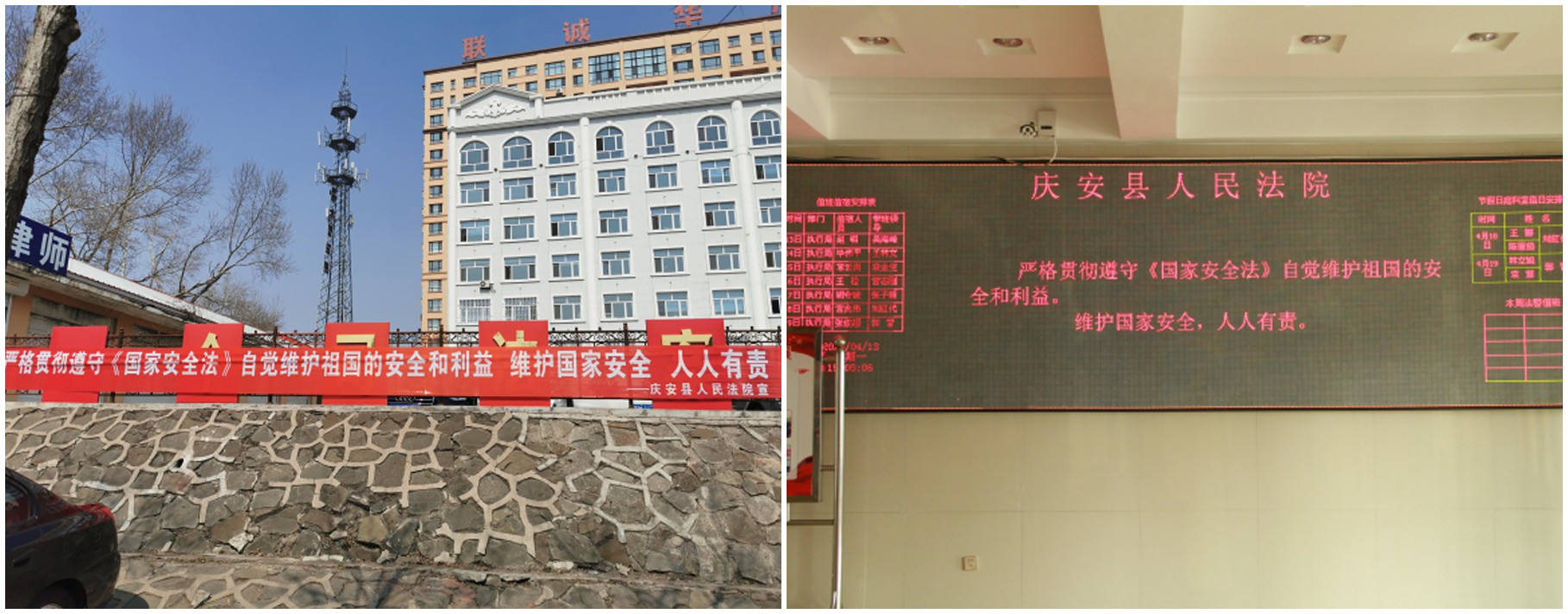 庆安法院在院机关设置了8张宣传展板,宣传疫情防控期间的有力举措和感人事迹、展示扫黑除恶专项斗争的重大部署和重大战果;利用电子显示屏打出关于国家安全的宣传标语;在院外悬挂宣传条幅。近期,还将组织干警学习“龙江网络学院”总体国家安全观和国家安全法专题并参加答题活动、收看国家安全观宣传教育片,利用“一网两微”积极开展国家安全法以及网络安全法、反间谍法、反恐怖主义法、核安全法、保密法等涉及国家安全法律的普法宣传活动。通过宣教活动进一步增强干部群众的国家安全意识,推动全社会形成维护国家安全的强大合力,为平安庆安建设做出积极努力。