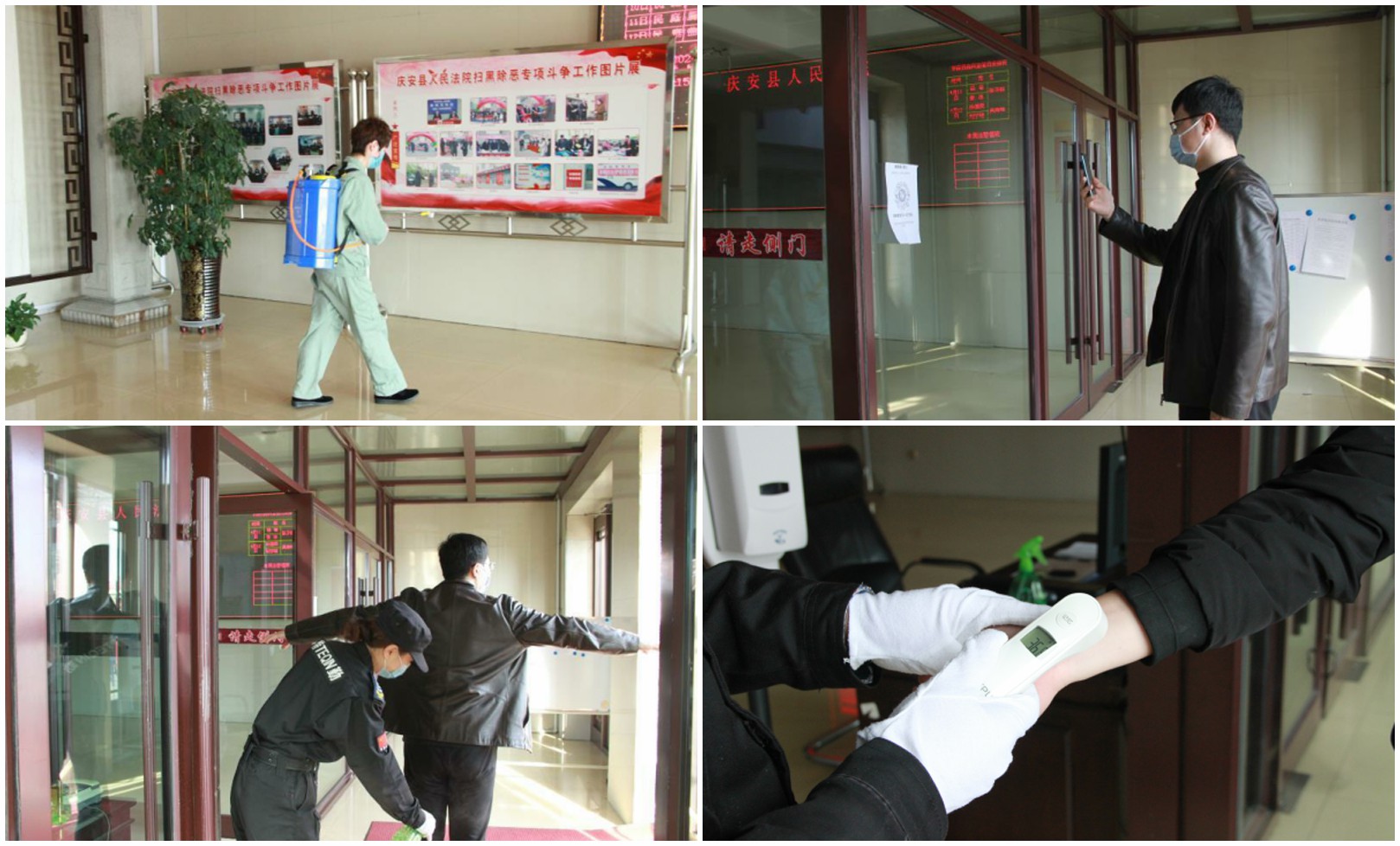 三是坚决实施用好防疫“四宝”。对院内人员严格执行扫码、测温、消毒、戴口罩;对来院办事、参加诉讼人员一律实行严格登记式管理,并扫码、测温、消毒、戴口罩。