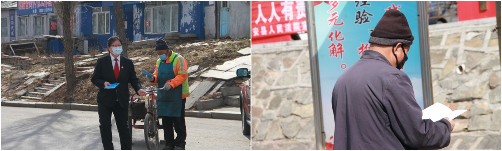 在庆安法院门前设置了宣传台,悬挂了宣传条幅,为了避免人群聚集,采取分散方式向过往群众发放了知识产权普法宣传手册100余册,解答群众法律咨询20余人次。