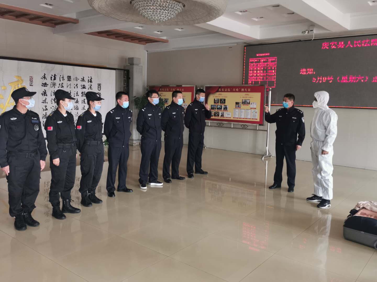 面对当前严峻的疫情形势,根据上级要求部署,庆安法院积极开展司法警察公共卫生防护科目强化训练,开展有针对性的处突演练。一是重点学习传染病和突发病的基本特征、传染特点、预防与处置方法、流程;二是通过“视频大讲堂”,学习防疫执勤工作规范、学习上级法院一系列关于疫情防控的文件指示要求;三是学习卫生救护技能,主要是包括现场对受伤人员实施心肺复苏术、止血、包扎、固定等救护措施;四是学习掌握骨干带班、每天对执勤人员上岗前讲解要领示范,离岗前小结等。