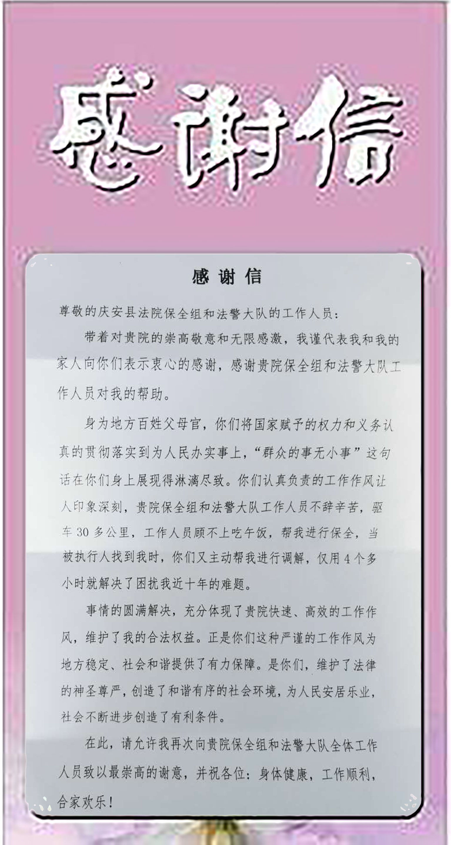 6月10日,庆安法院保全团队收到来自当事人王某的一封感谢信,感谢保全法官和法警大队干警及时出击,通过为其保全追回了60万元的欠款。