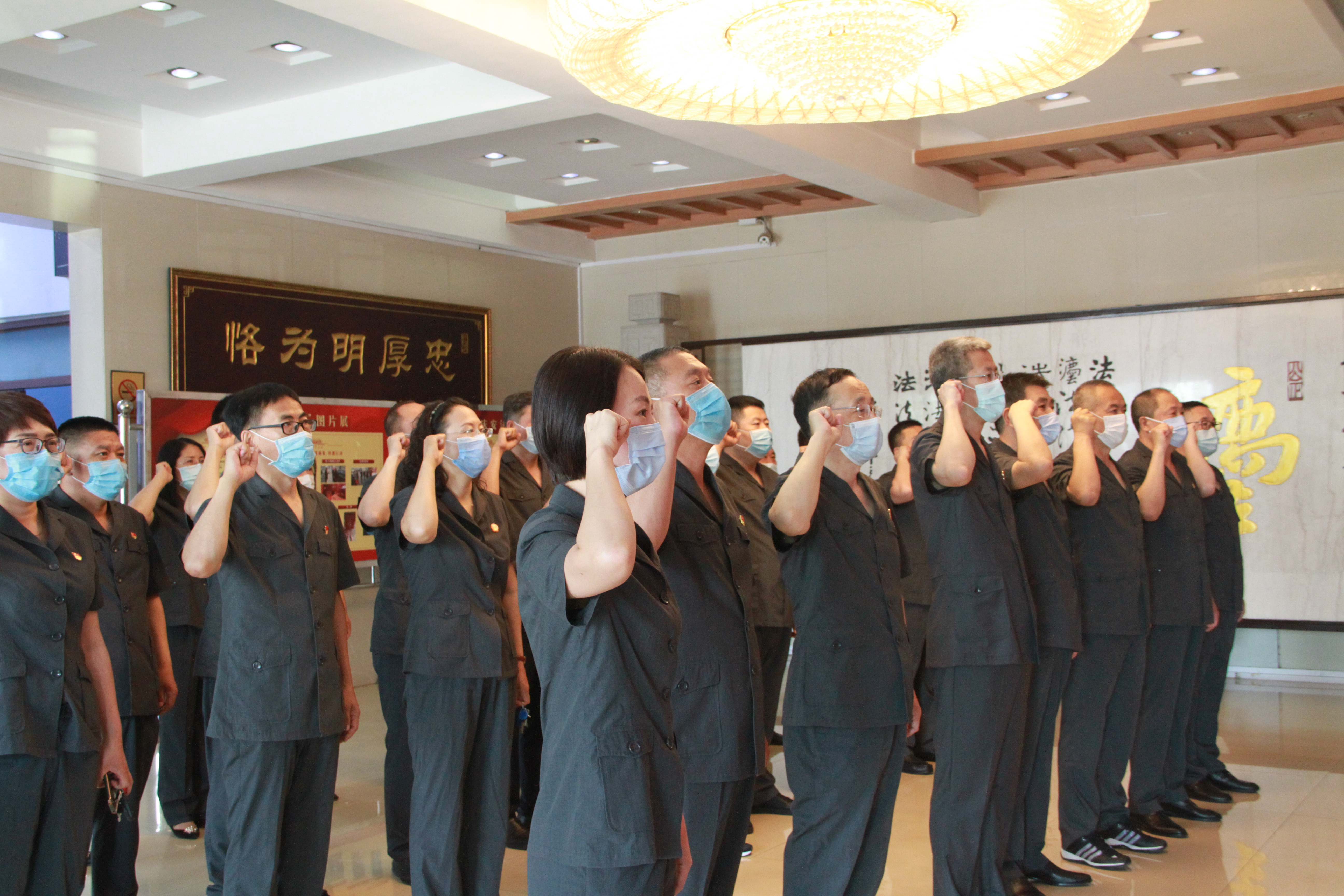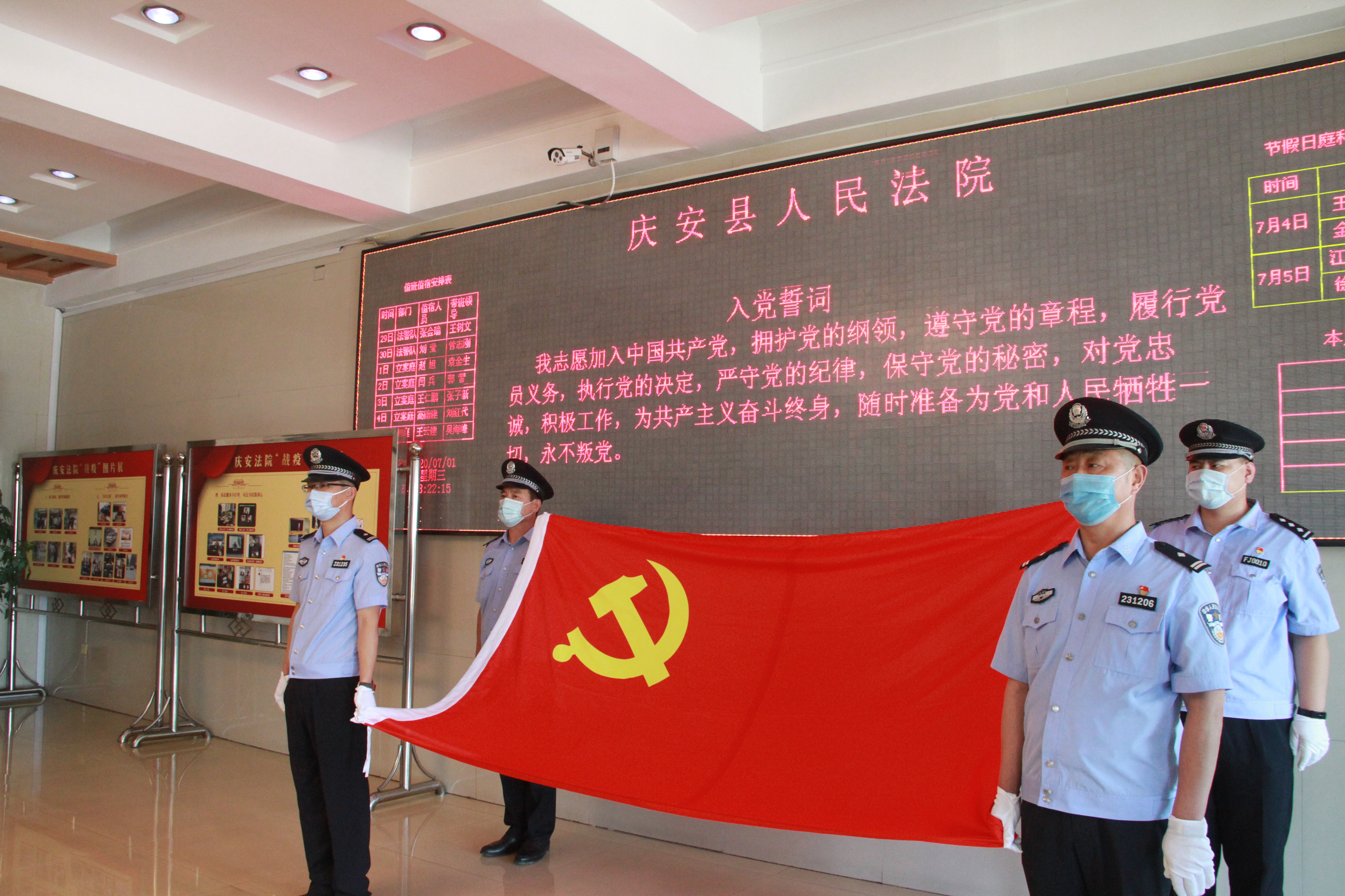 7月1日8:00时,庆安法院组织党员干警举行了庆祝建党99周年重温入党誓词活动。