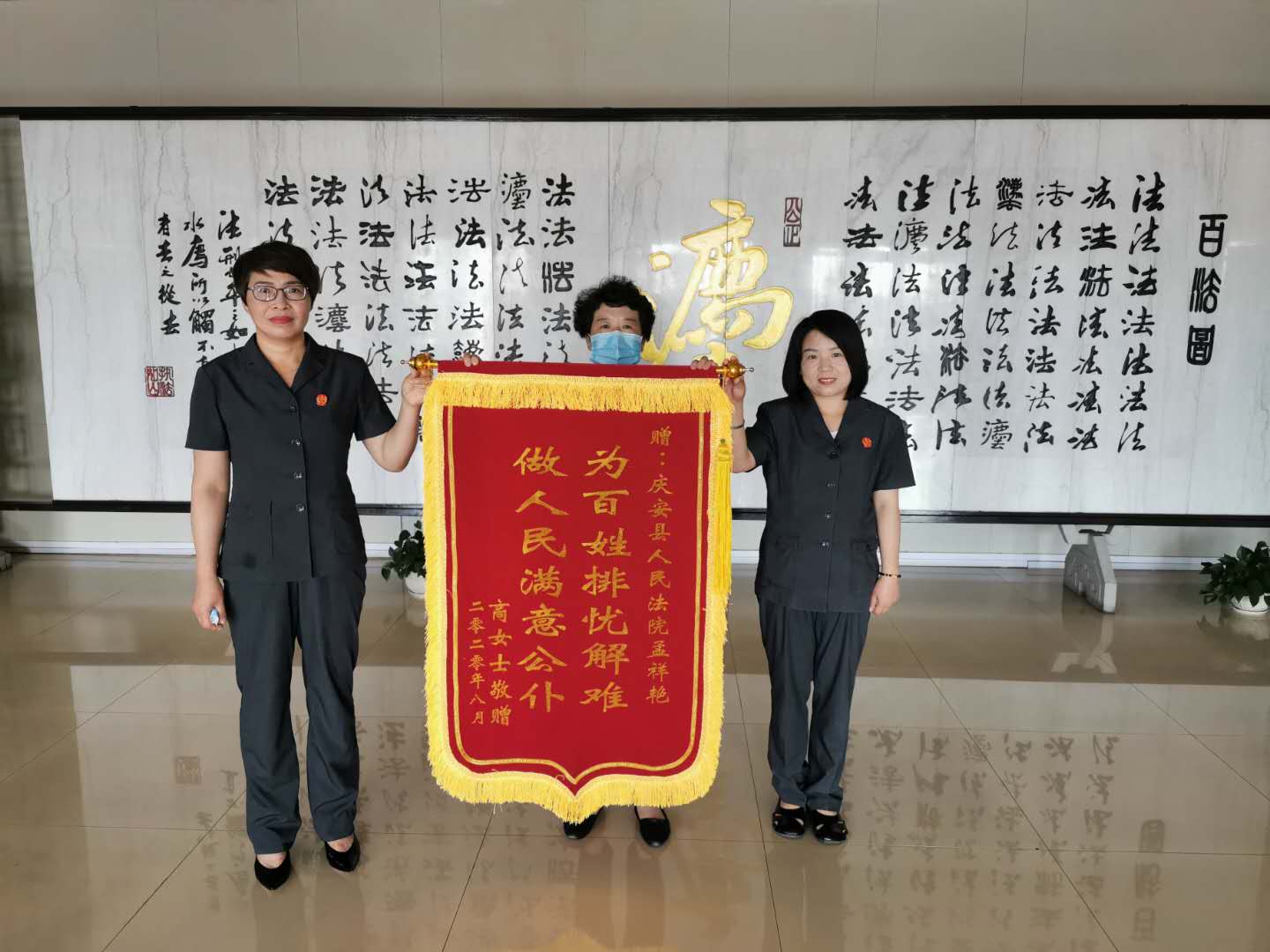 8月11日,庆安法院速裁团队法官适用“要素式”方式快速审结一起民间借贷纠纷案件,当事人送锦旗感谢。