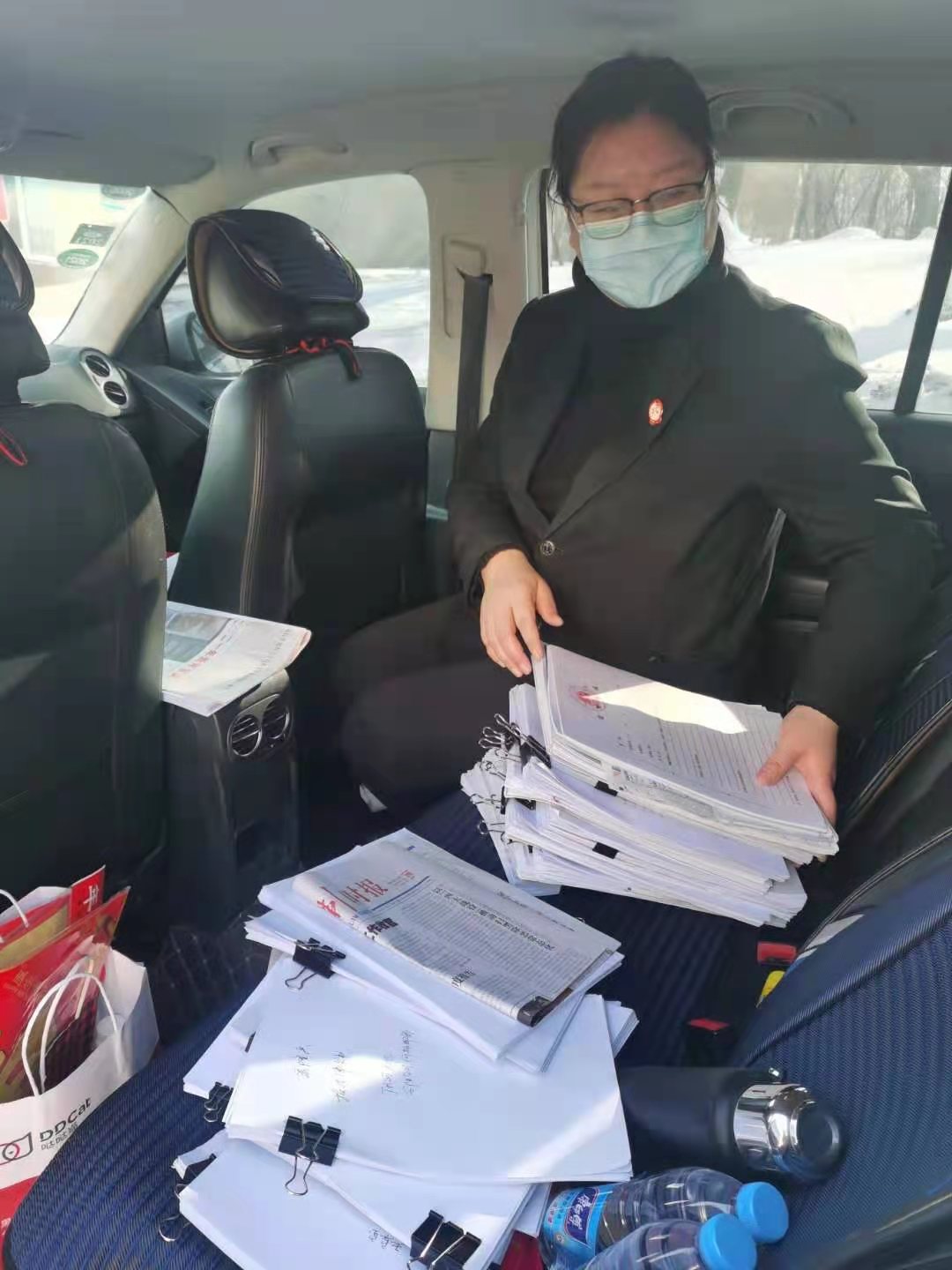 院机关相关部门的同志也在忙碌着自己急于处理的工作。张张工作照片在工作群里展示,条条通知在工作群里发出,防疫工作和审判工作有条不紊同步进行。院党组十分关心在寒冷天气中执勤的同志们,孙院长一早就在工作群里提醒大家多穿衣服注意保暖,并亲临一线慰问执勤干警,为大家送去了热乎乎的奶茶,叮嘱大家注意防护安全,完成好工作保护好自己。办公室为解决早晚取送车干警的不便,向相关部门积极申请了通行证。