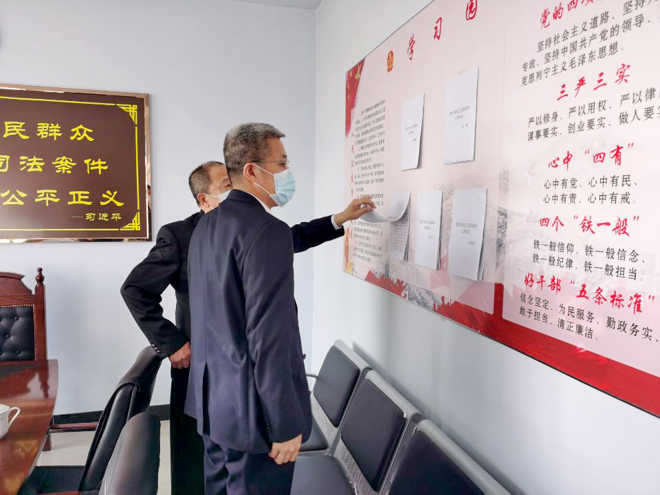 检查中,孙宏辉听取了各法庭工作开展情况汇报,实地查看了干警学习资料、学习记录、学习笔记、宣传图版和标语、“我为群众办实事”活动方案、台账,实地督查,提出指导性意见,对存在问题就地整改。