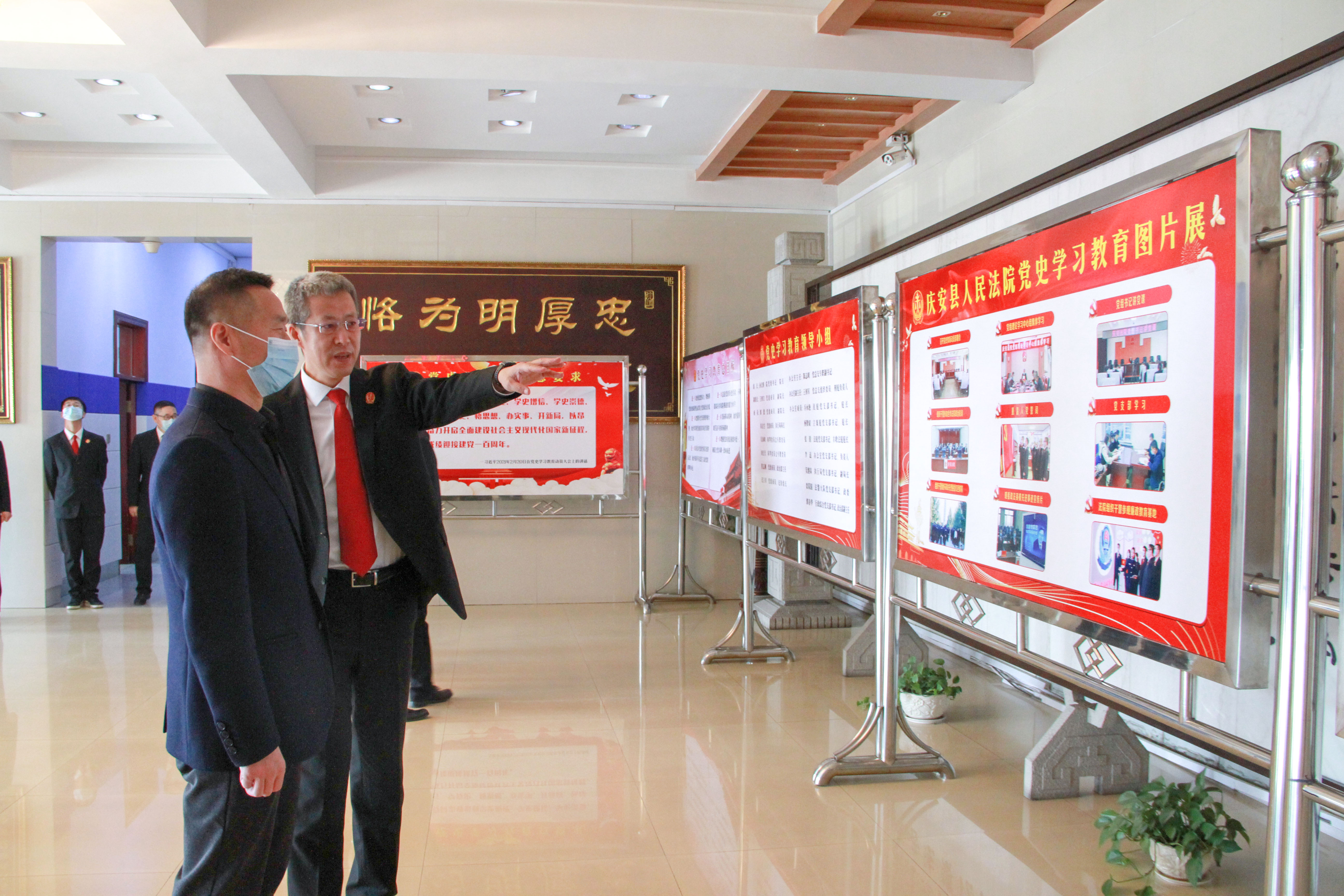 指导组一行现场视察了庆安法院诉讼服务中心“一站式”诉讼服务工作,详细询问了“说和人老李”调解工作室多元解纷工作情况,观看了党史学习教育活动展板,并通过查阅卷宗、听取汇报等形式实地了解了庆安法院党史学习教育工作情况,对庆安法院取得的阶段性成效给予了肯定,对学习教育工作提出了建议,进行了现场指导。