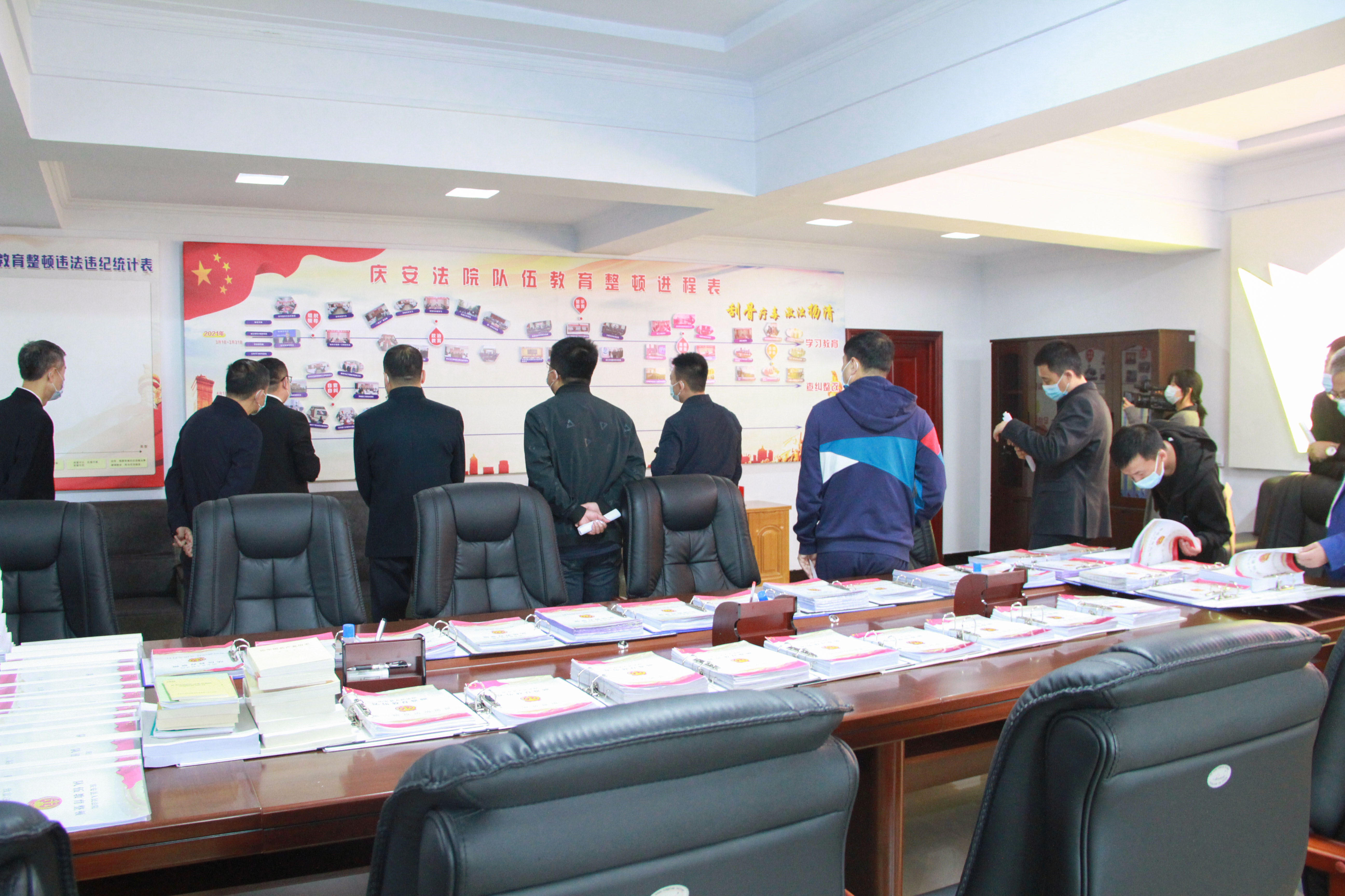 在队伍教育整顿领导小组办公室,胡晓飞一行听取了庆安法院队伍教育整顿开展情况简要汇报,并查阅了相关资料。