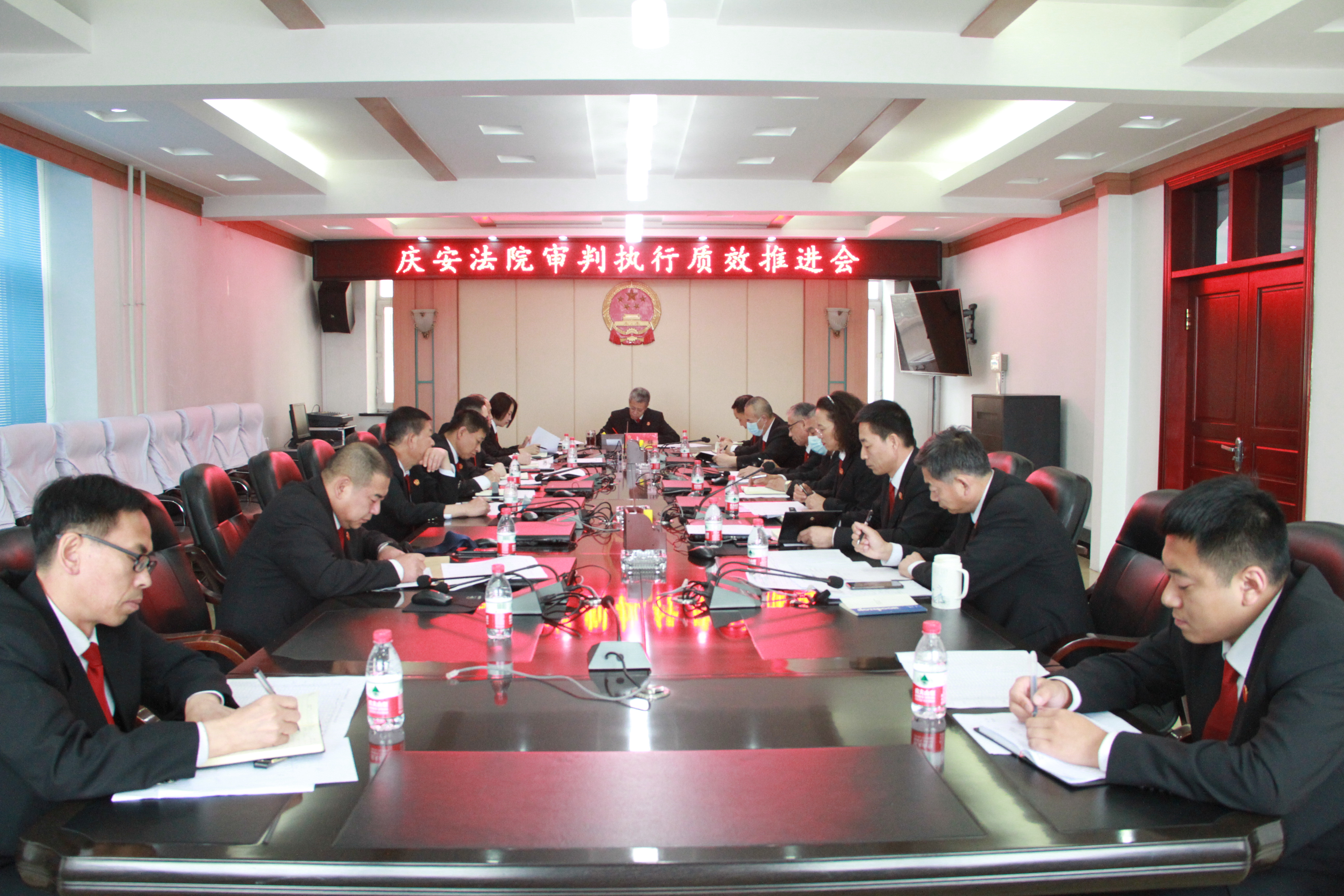 5月9日下午,庆安县人民法院召开审判执行质效推进会,贯彻落实全市法院审判执行质效推进会议精神。党组书记、院长孙宏辉主持会议并讲话,党组成员及各业务部门负责人参加会议。