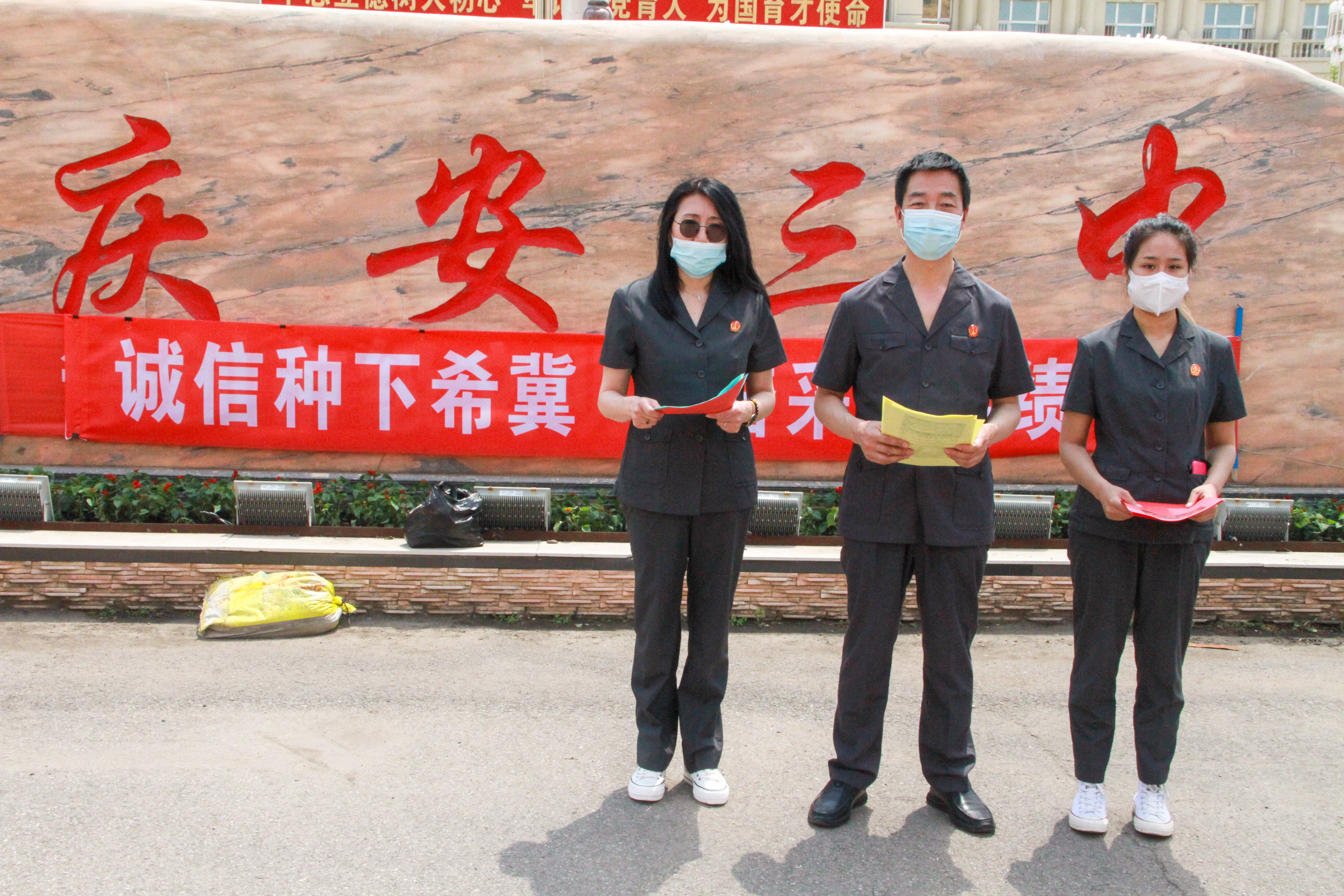 5月31日中午,在庆安县第三中学学生中午放学之际,庆安县人民法院刑庭干警来到校门口进行普法宣传,为即将高考的学生打一针“强心剂”。