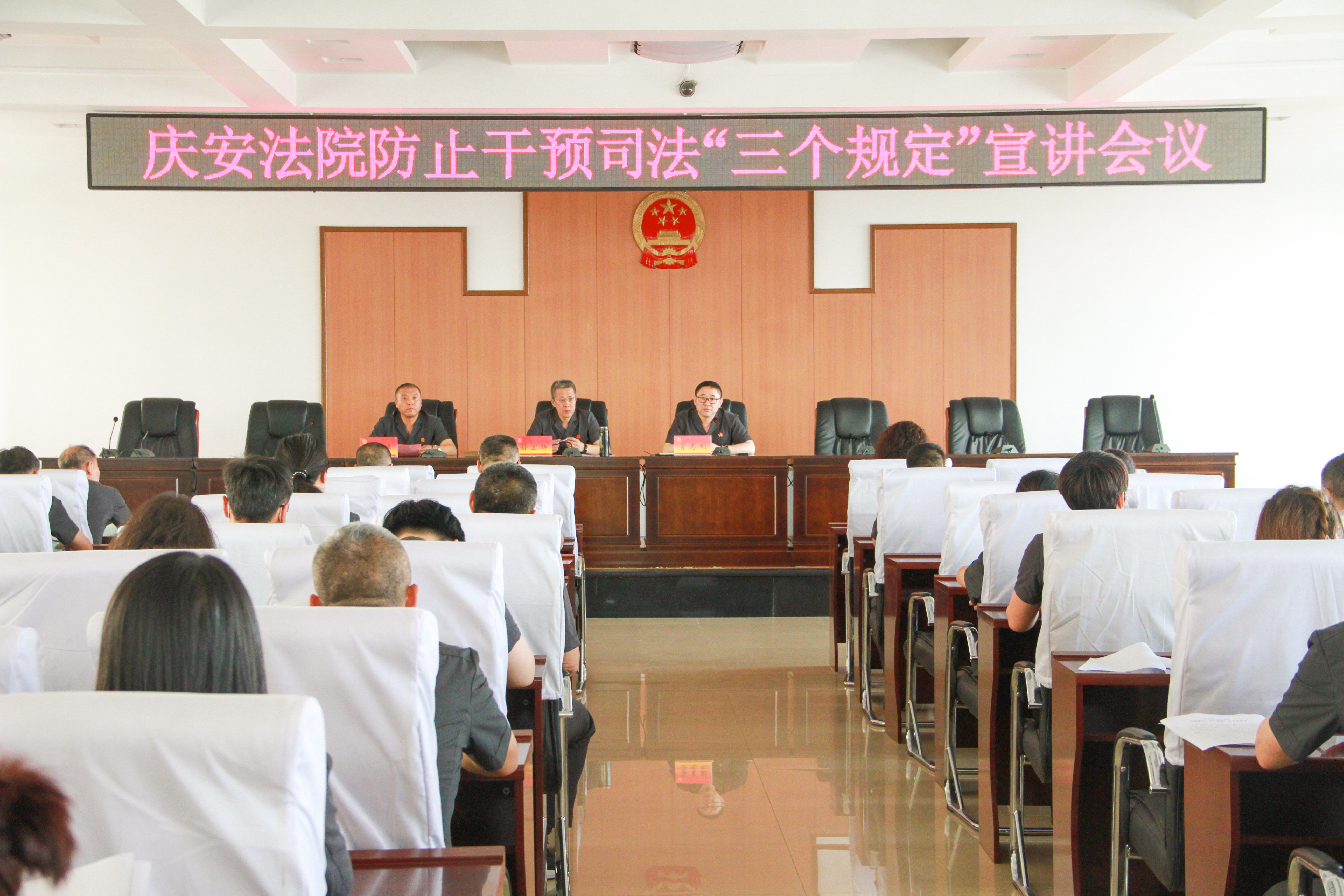 为深入贯彻中央关于政法队伍教育整顿工作决策部署,坚决落实《领导干部干预司法活动、插手具体案件处理的记录、通报和责任追究规定》《司法机关内部人员过问案件的记录和责任追究规定》和《关于进一步规范司法人员与当事人、律师、特殊关系人、中介组织接触交往行为的若干规定》要求,简称“三个规定”,严格规范司法行为,确保公正廉洁司法,6月11日,庆安县人民法院召开防止干预司法“三个规定”宣讲会议。