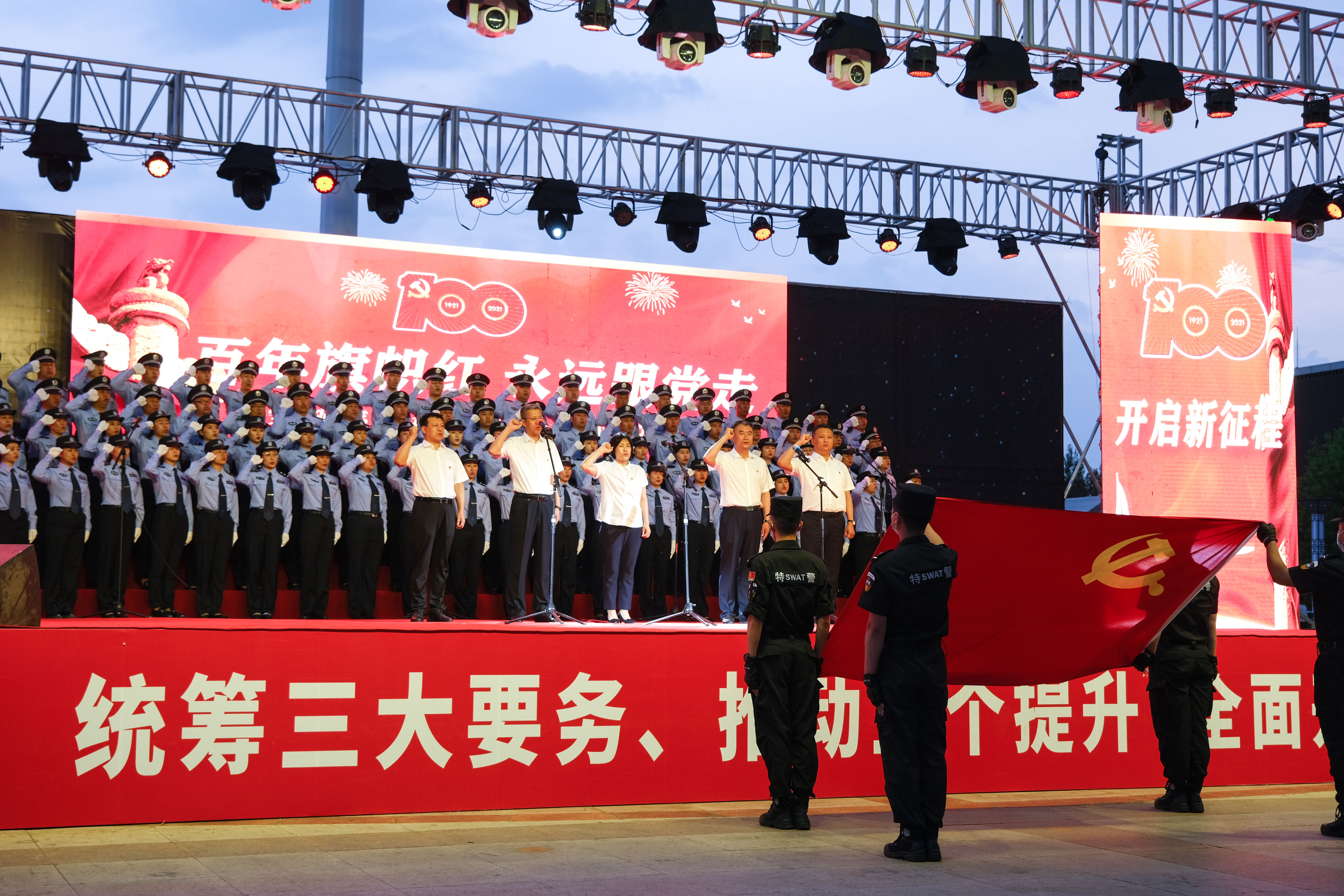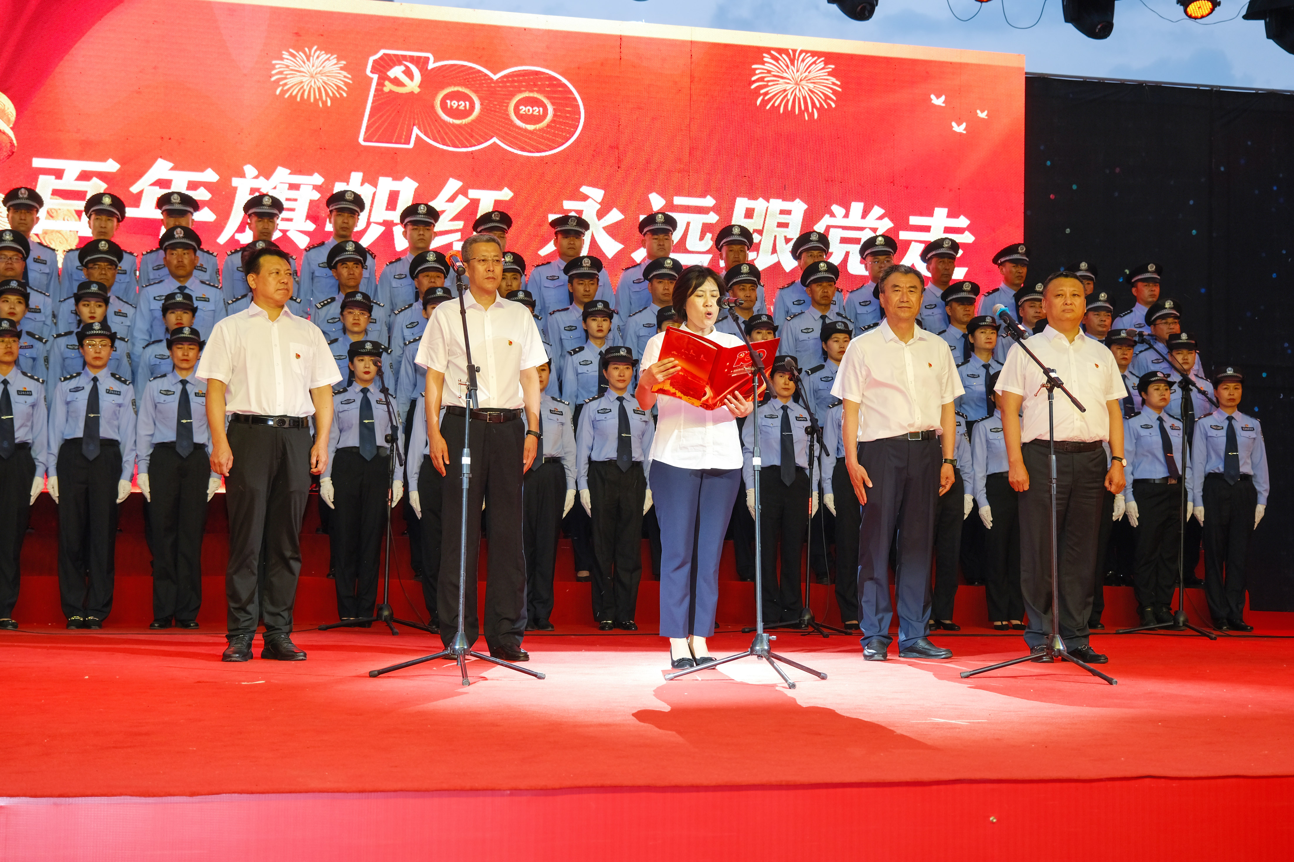 庆安县政法委书记宋兆丽同公检法司“四长”带领政法干警面向党旗重温了入党誓词。随着铿锵有力的宣誓声,全体党员高举右拳,面向党旗,一字一句,拉开了庆祝建党100周年“百年旗帜红 永远跟党走”主题文艺演出的序幕。