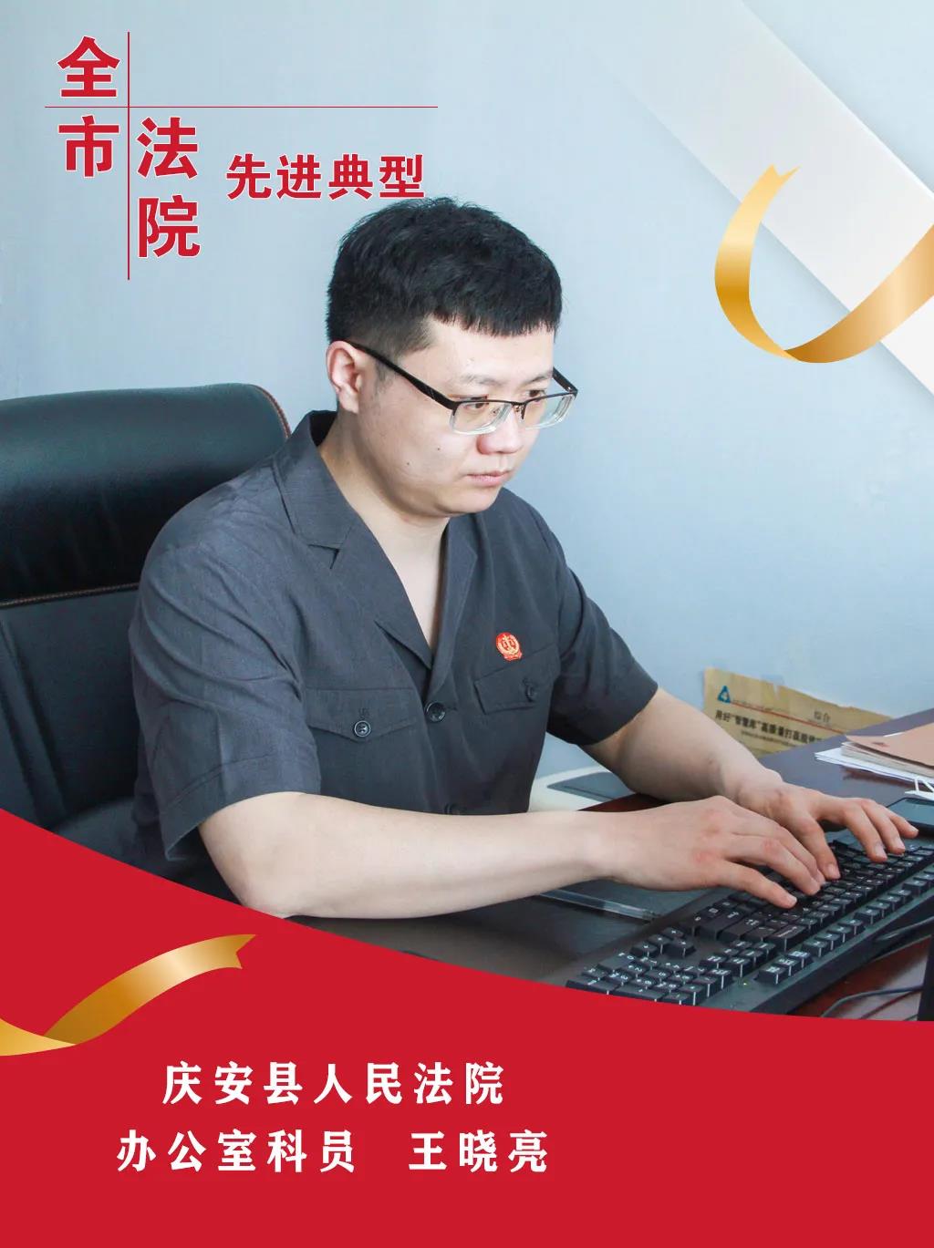 王晓亮,男,汉族,1990年2月出生,本科学历,中共党员,现任庆安县人民法院办公室文秘。该同志政治素质高、精神状态佳、工作能力强、善于组织协调,热爱祖国、爱岗敬业、诚信友善、乐于奉献,具有良好的道德品行和职业操守,工作业绩较为突出,得到领导和同志们的一致认可和好评。