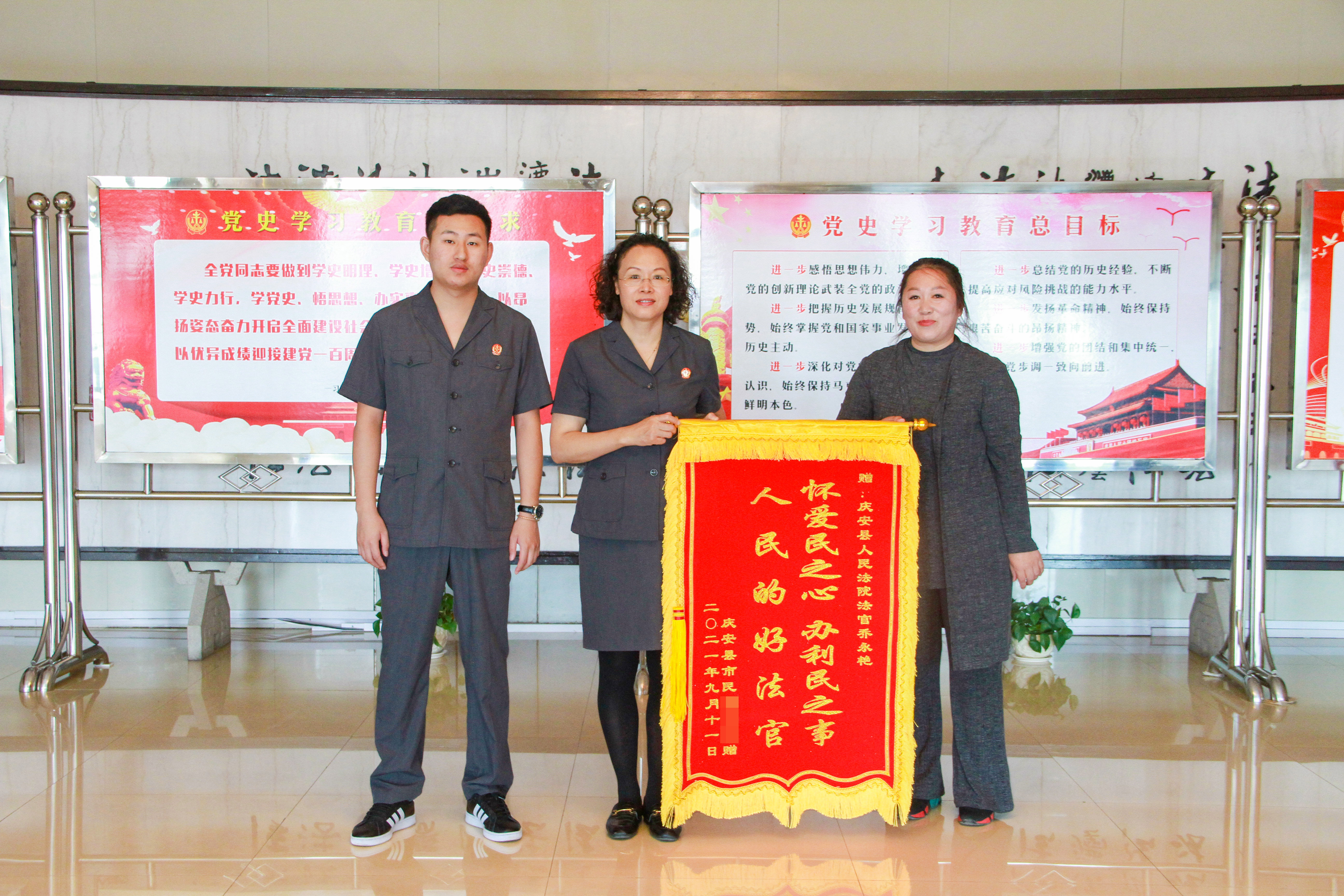 9月15日上午,案件当事人刘女士将一面绣有“怀爱民之心 办利民之事 人民的好法官”的锦旗送到庆安县人民法院民事审判庭庭长乔永艳手中,以表达对法官秉公尽责、司法为民的充分认可和由衷的感谢。