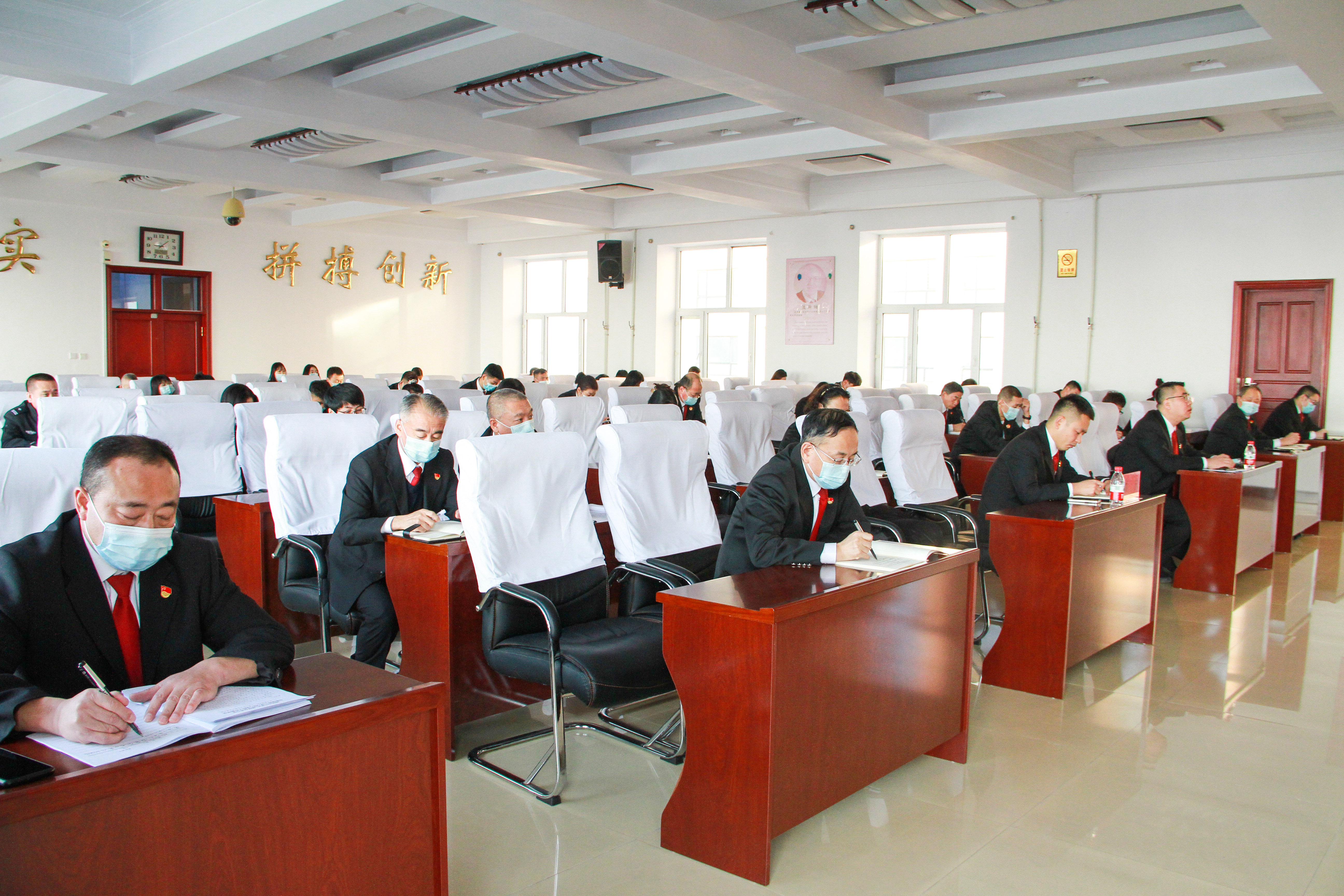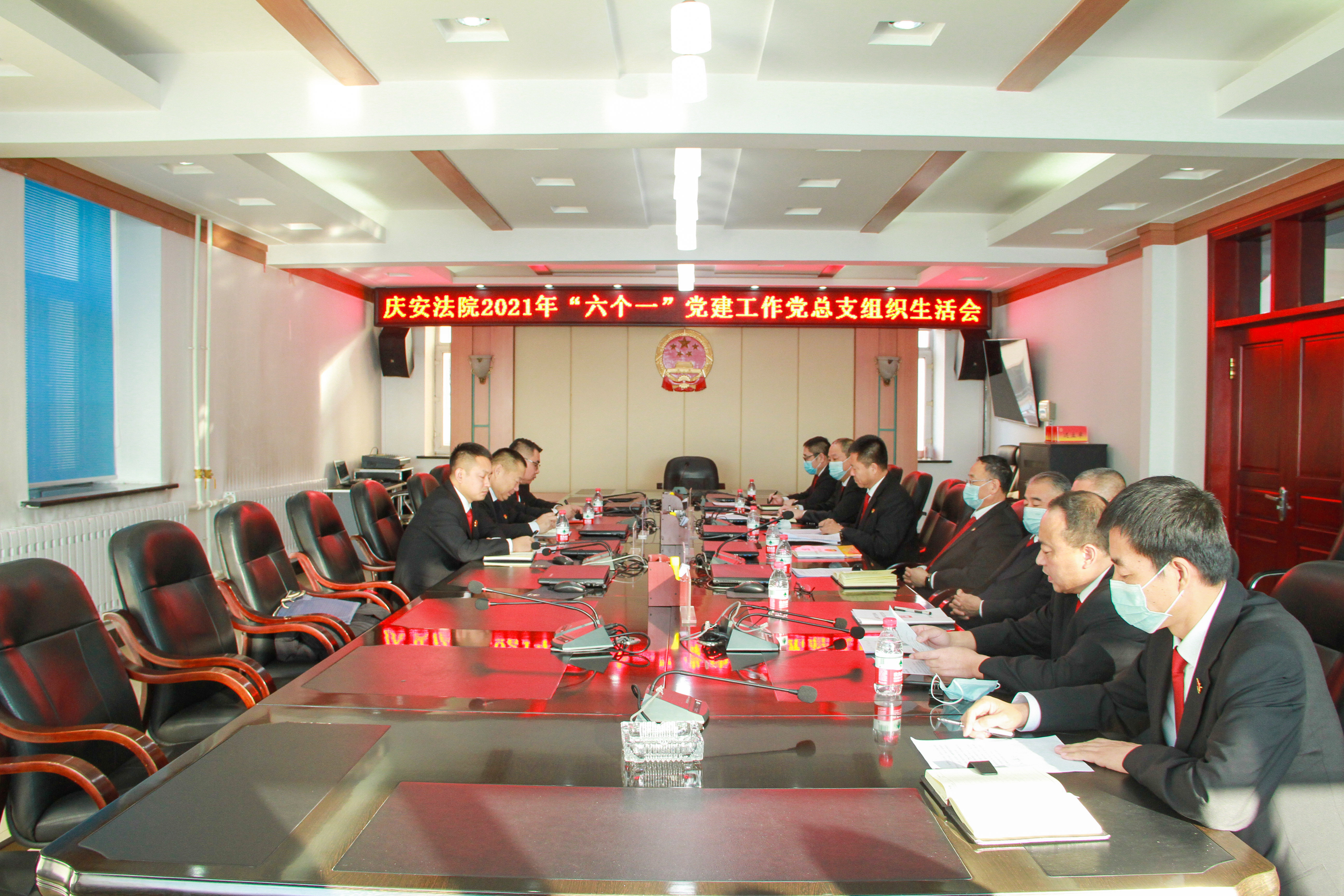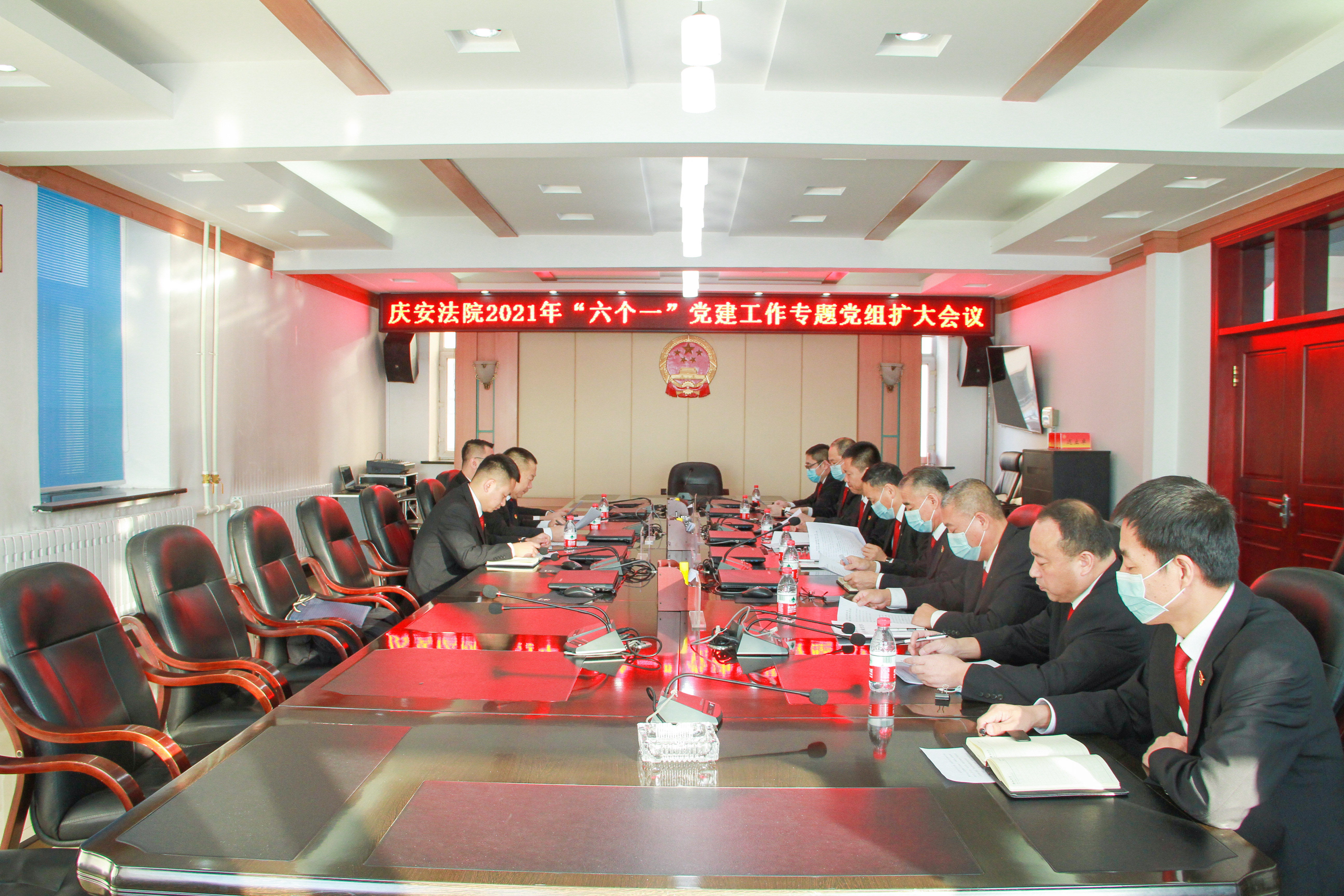 郝永明一行参加了庆安法院党建工作专题党组(扩大)会议,听取了2021年度庆安法院党建工作开展情况的汇报,对庆安法院党建工作取得的成绩给予了充分肯定,就庆安法院党建工作和今后党建工作计划有针对性的进行了分析、研究和讨论,与参会人员进行了深入细致的交流。