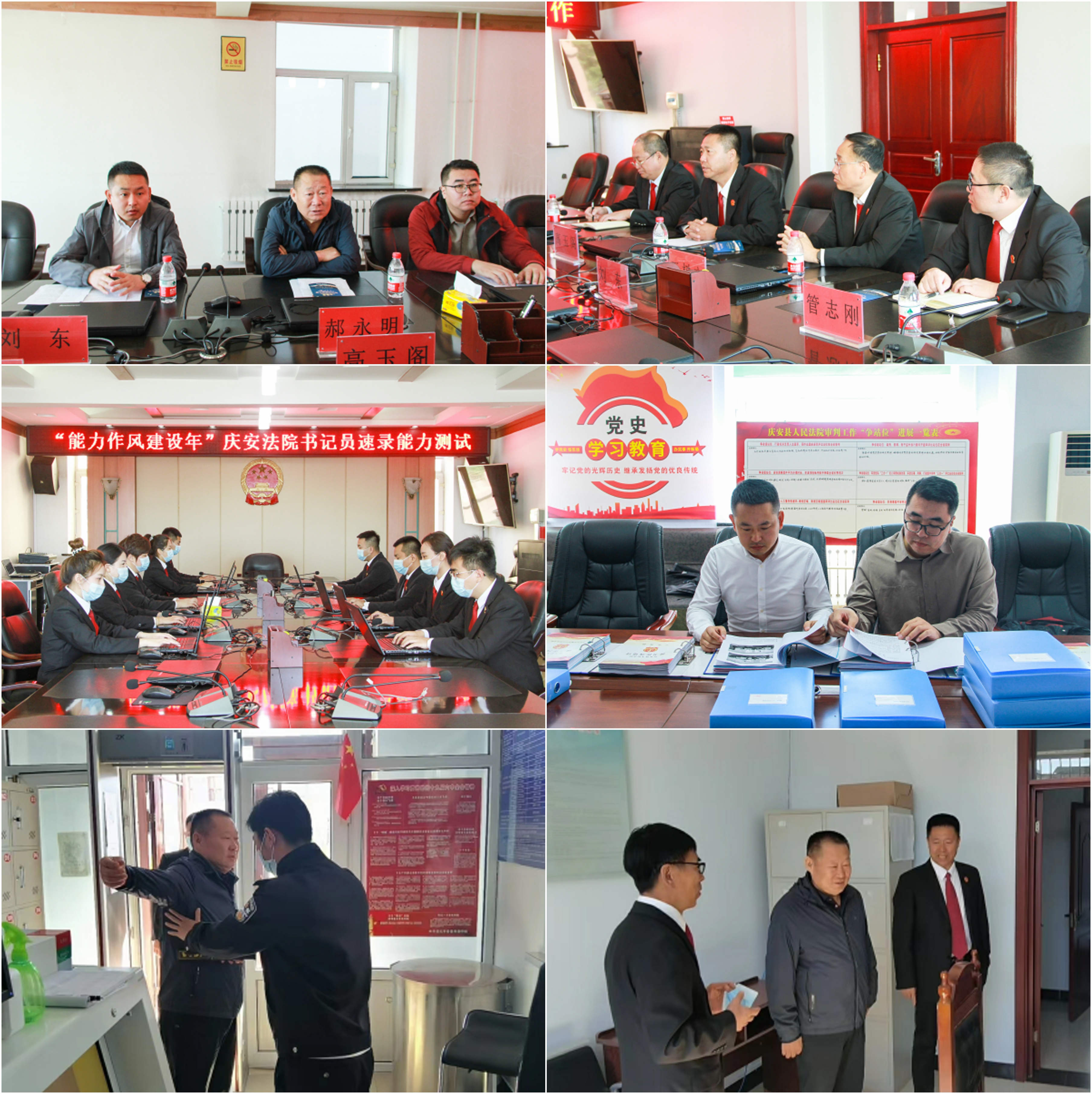 上午,郝永明一行听取了庆安法院能力作风建设年工作开展情况报告;对书记员速录能力进行了测试;查阅了能力作风建设相关档案材料;在元宝法庭开展了走流程活动并对机关和法庭维稳安保工作进行了检查;下午,郝永明一行与不同层次和岗位的干警进行了谈话,向人大代表、政协委员征求了对法院的意见和建议。