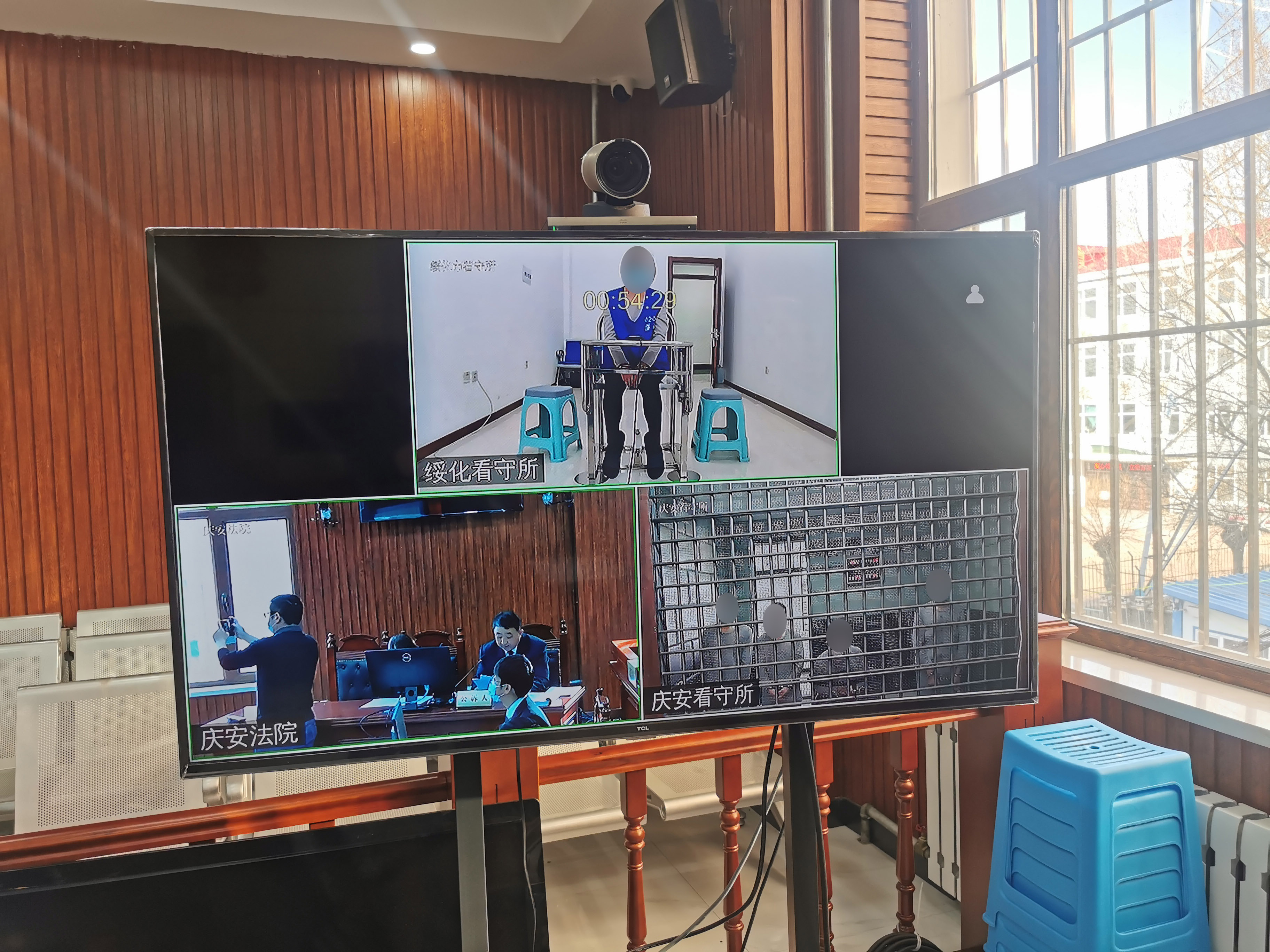 由于该起案件的5名被告人分别羁押在绥化市看守所和庆安县看守所两地,为了保证公平正义不因疫情而迟到,庆安法院充分运用智慧法院建设成果,采用“线上+线下”方式开庭审理刑事案件,法官、检察官、辩护人与在看守所的被告人“隔空”庭审。