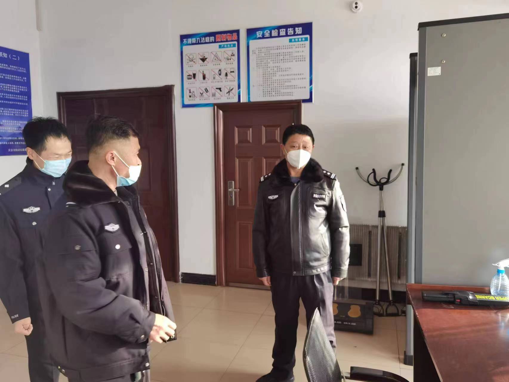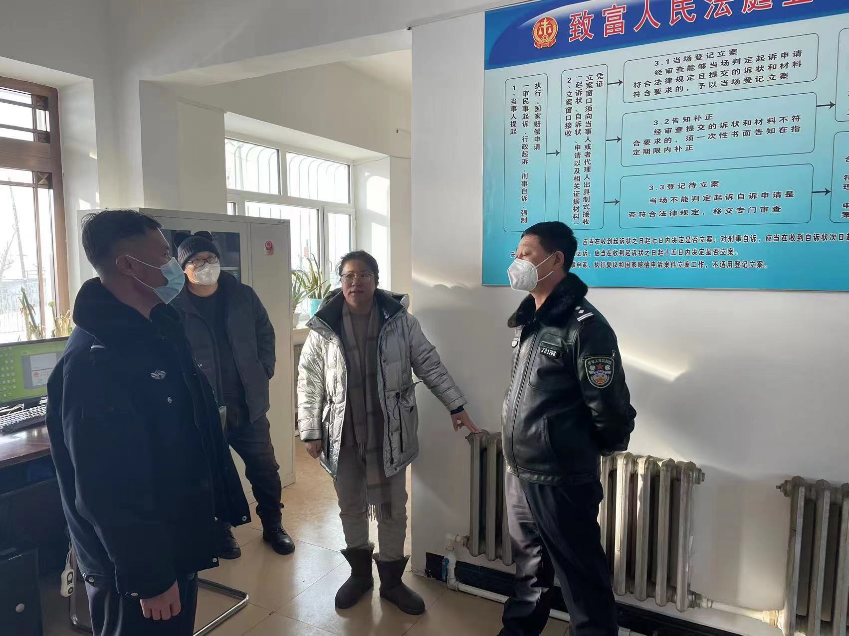 春节将至,庆安县人民法院为了切实做好节前安全隐患排查工作,有效防范排除各类风险隐患,确保节日期间安全稳定。1月19日,庆安法院法警大队大队长栾荣国、副队长张会瑜一行到元宝、致富、丰收和大罗镇四个人民法庭检查安保工作。
