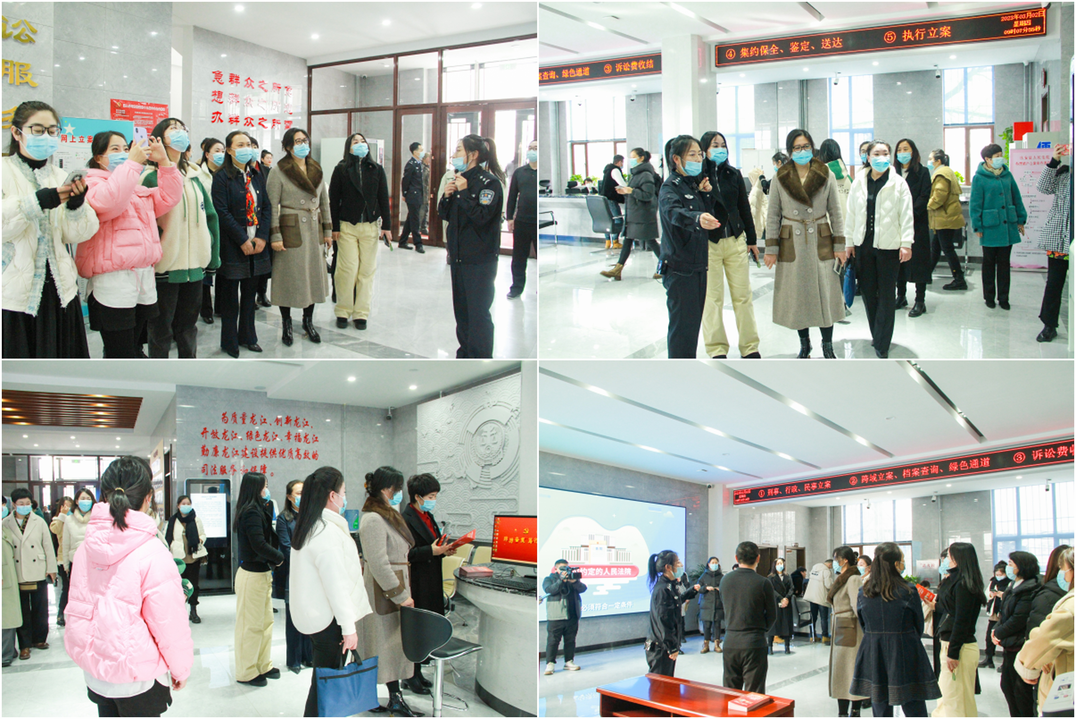 妇女代表们在讲解员的引导下,先后参观了诉讼服务中心、“说和人老李”调解工作室、廉政文化长廊、党建文化长廊、审判法庭等,直观感受信息时代法院的文化建设和信息化建设,对现代一体化的诉讼立案方式有了更直观的认识,看到了法院人性化的便民服务设施,了解了法院的审判工作流程,真切地感受到了司法“温度”。