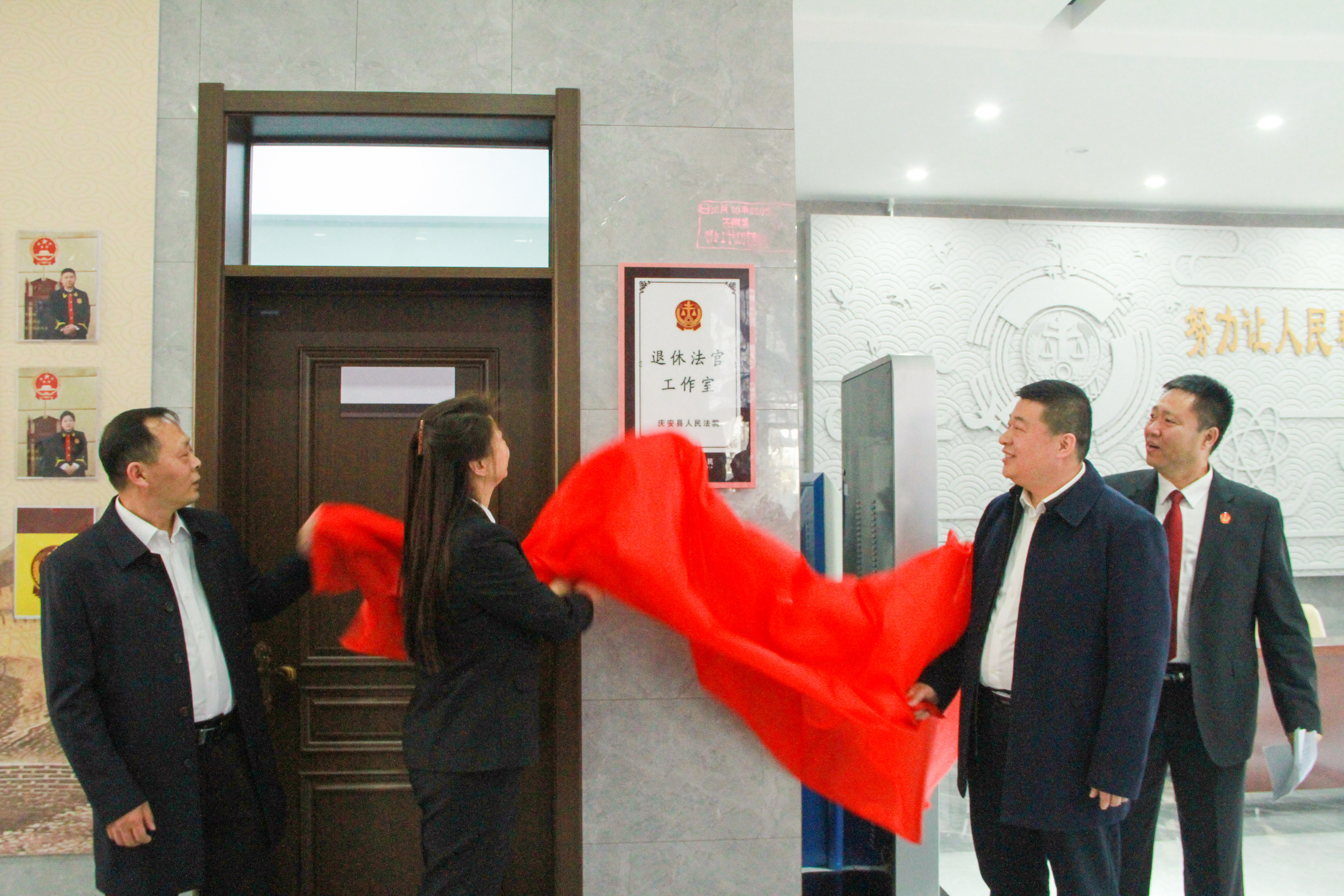 为推动诉前调解触角向基层延伸,从源头上减少诉讼增量,切实把非诉讼纠纷解决机制挺在前面,3月31日上午,庆安县人民法院退休法官工作室正式挂牌成立。庆安县委常委、政法委书记杨士锋、绥化市中级人民法院立案庭庭长赵淑丽、副庭长王鹤、庆安县司法局副局长孙长龙、安泰街道主任姜志海及相关社区书记、庆安法院中层以上领导干部出席揭牌仪式。