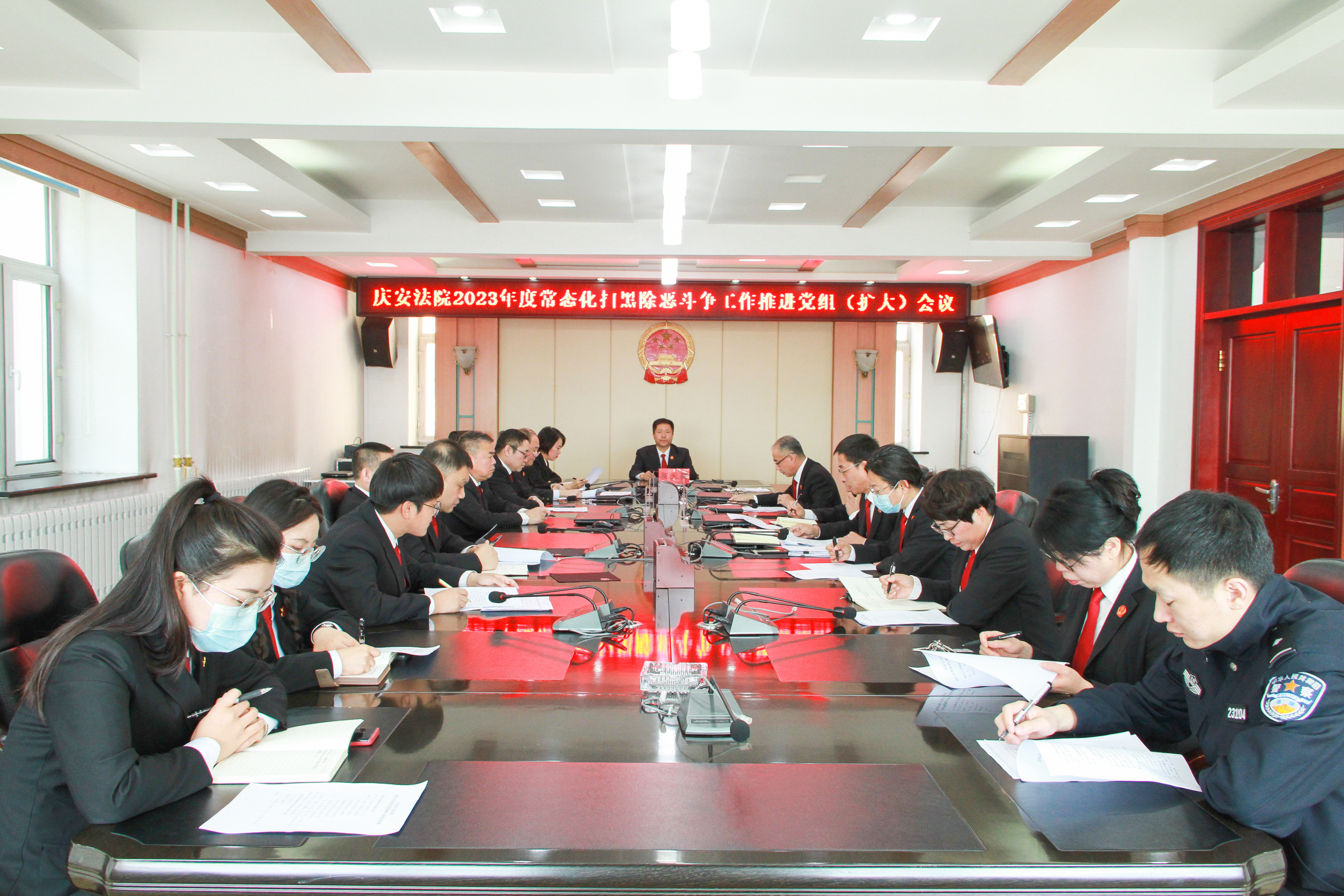 为全面贯彻习近平总书记关于常态化开展扫黑除恶斗争的重要指示精神,深入贯彻全市和全县常态化扫黑除恶工作推进会议精神,4月27日下午,庆安县人民法院召开2023年常态化扫黑除恶斗争工作推进党组(扩大)会议。党组书记、院长高玉阁主持会议并讲话,党组成员、各部门负责人和院扫黑办全体成员参加会议。