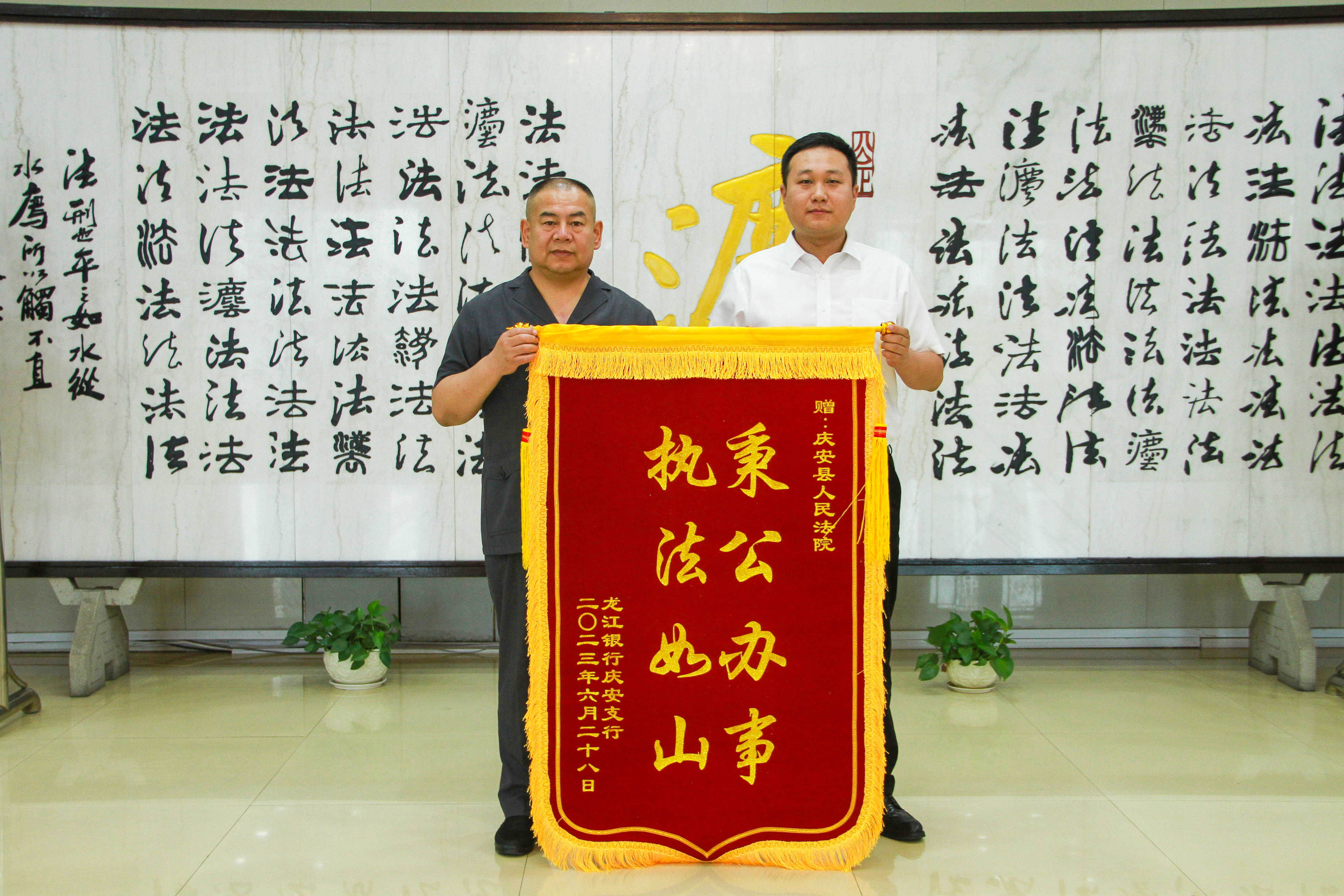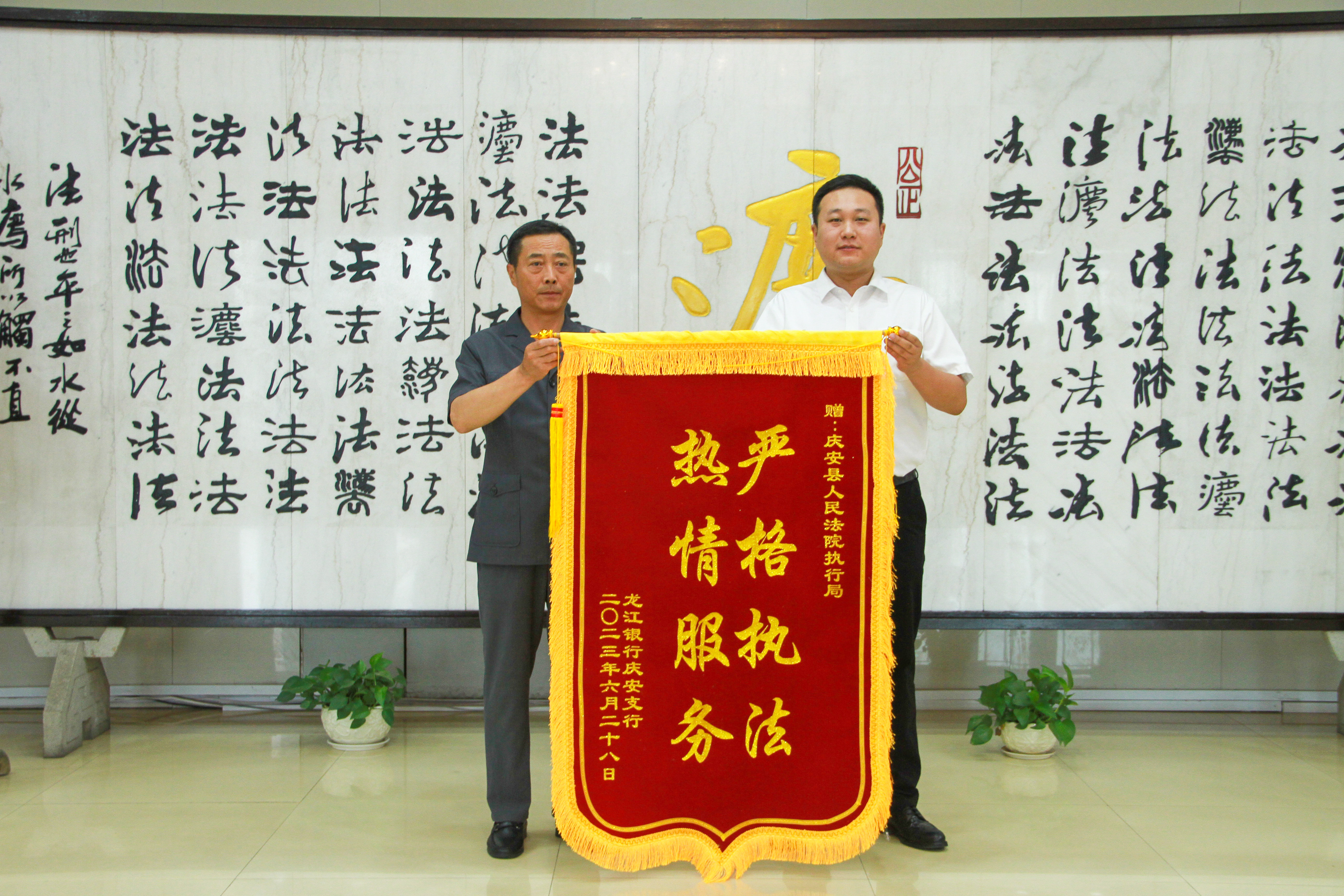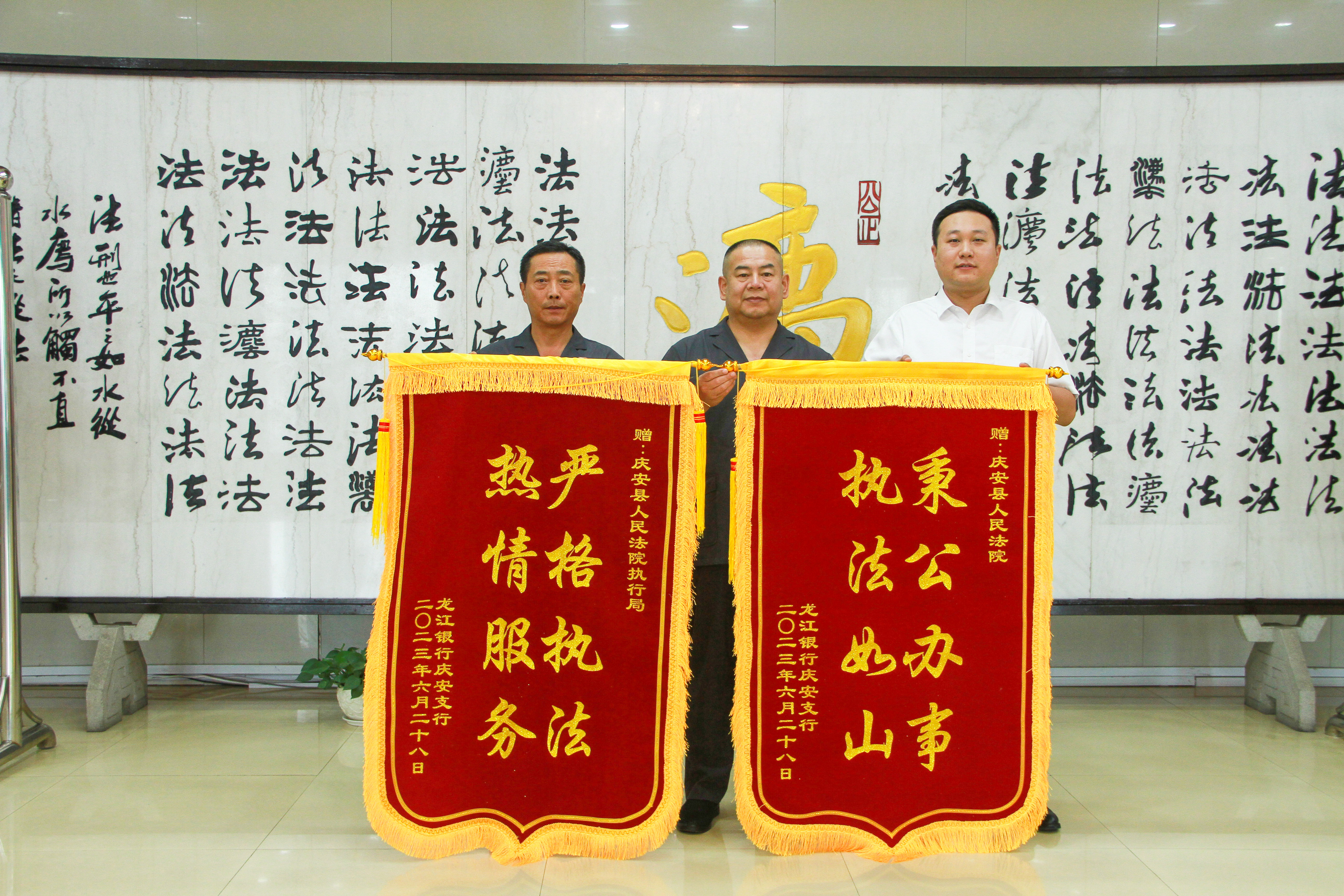 2023年7月24日上午,龙江银行庆安支行工作人员专程到庆安县人民法院,将一面印有“秉公办事 执法如山”的锦旗,送到院党组成员、执行局局长张锐手中,感谢庆安法院为金融企业保驾护航;同时将一面印有“严格执法 热情服务”的锦旗送给执行局全体干警,为一心扑在办案上、用心为民办实事的全体执行干警点赞称好。