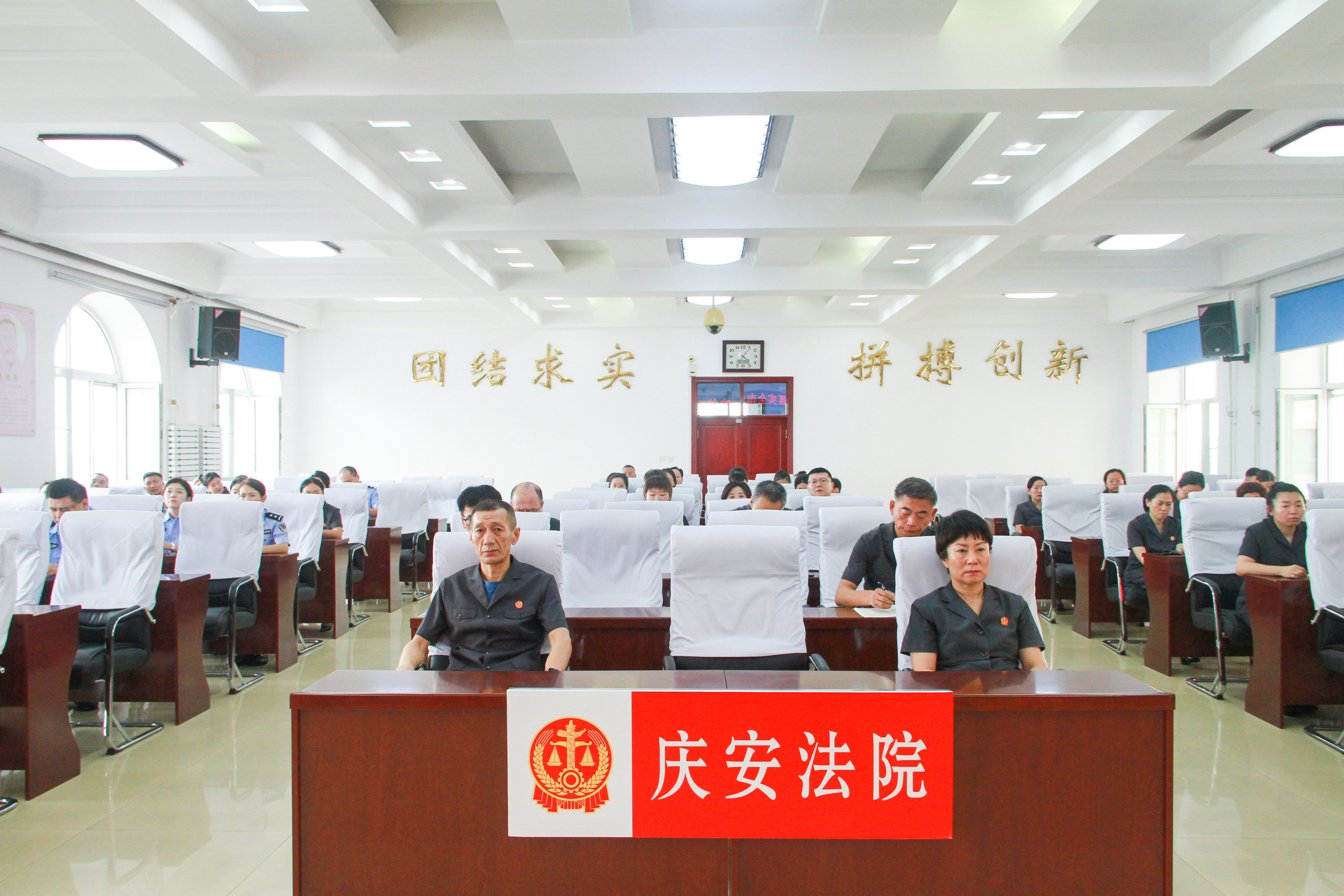 8月1日下午,庆安县人民法院召开专题干警大会,传达学习全国大法官研讨班和全省高级法官研讨班精神,贯彻全市法院能动司法研讨会议精神。党组书记、院长高玉阁出席会议并讲话,党组成员、副院长王树文主持会议,班子成员、全体干警参加会议。