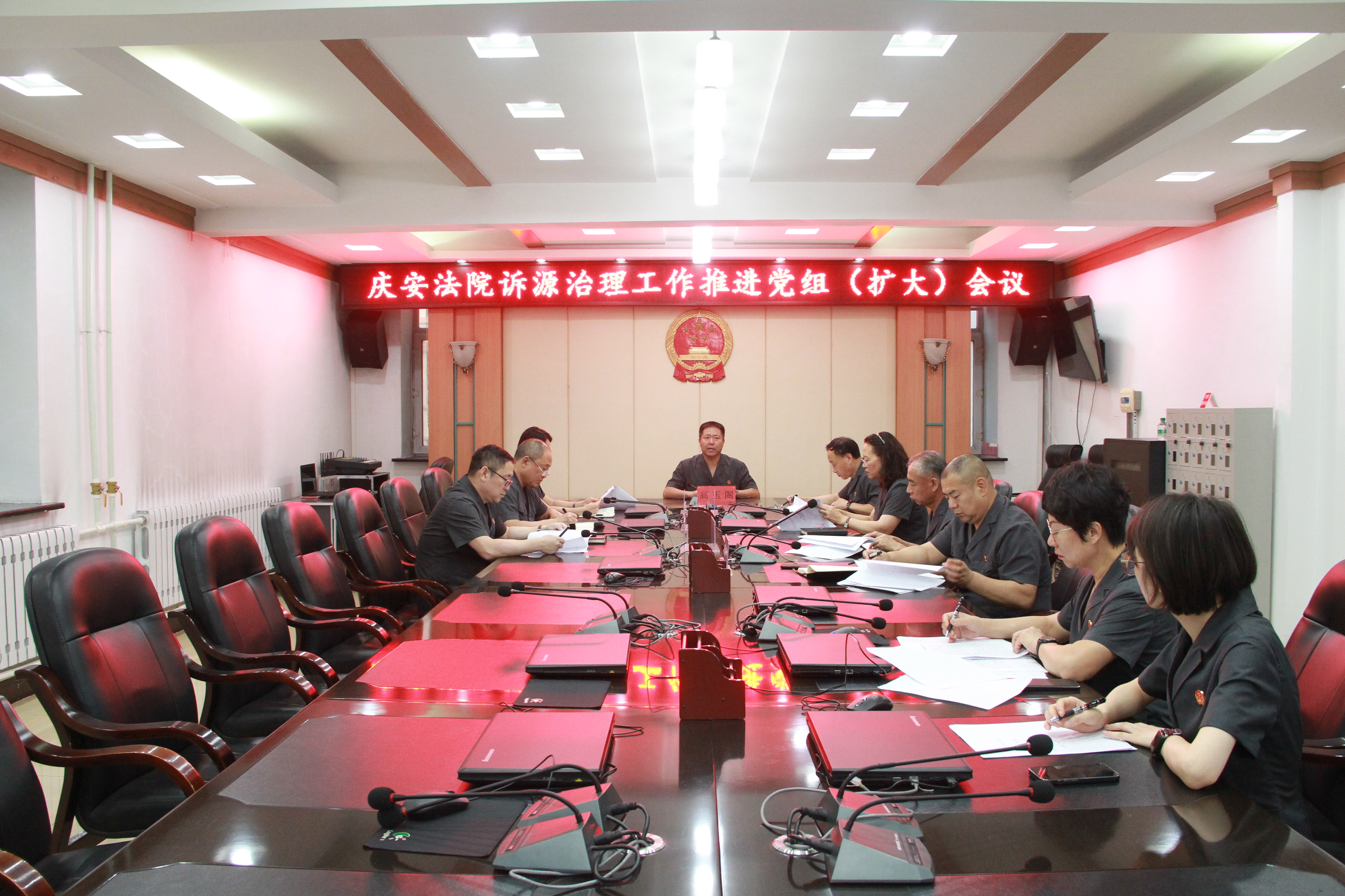 8月29日下午,庆安县人民法院召开诉源治理工作推进党组(扩大)会议,党组书记、院长高玉阁主持会议,全体党组成员参加会议,立案庭庭长及相关人员列席会议。