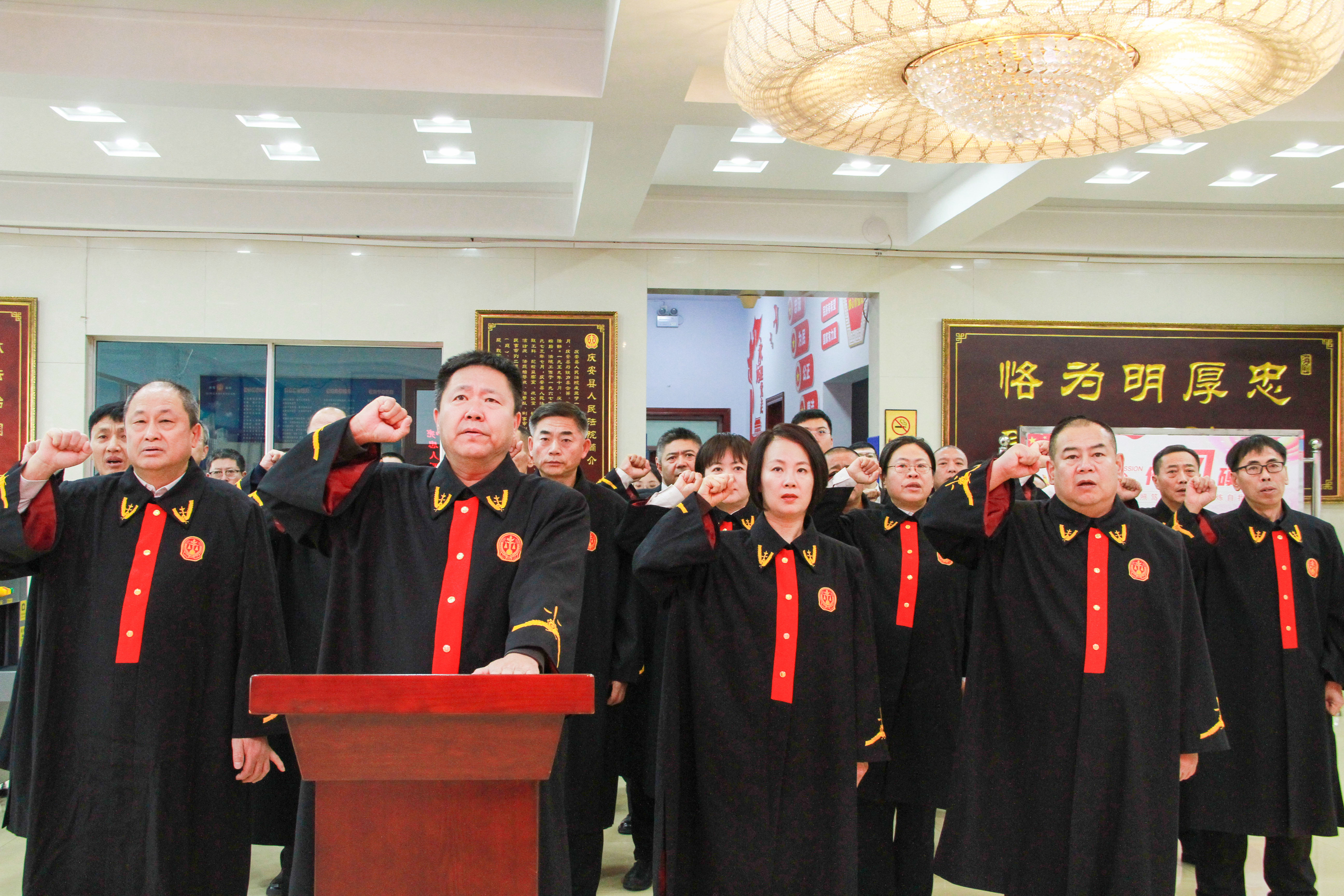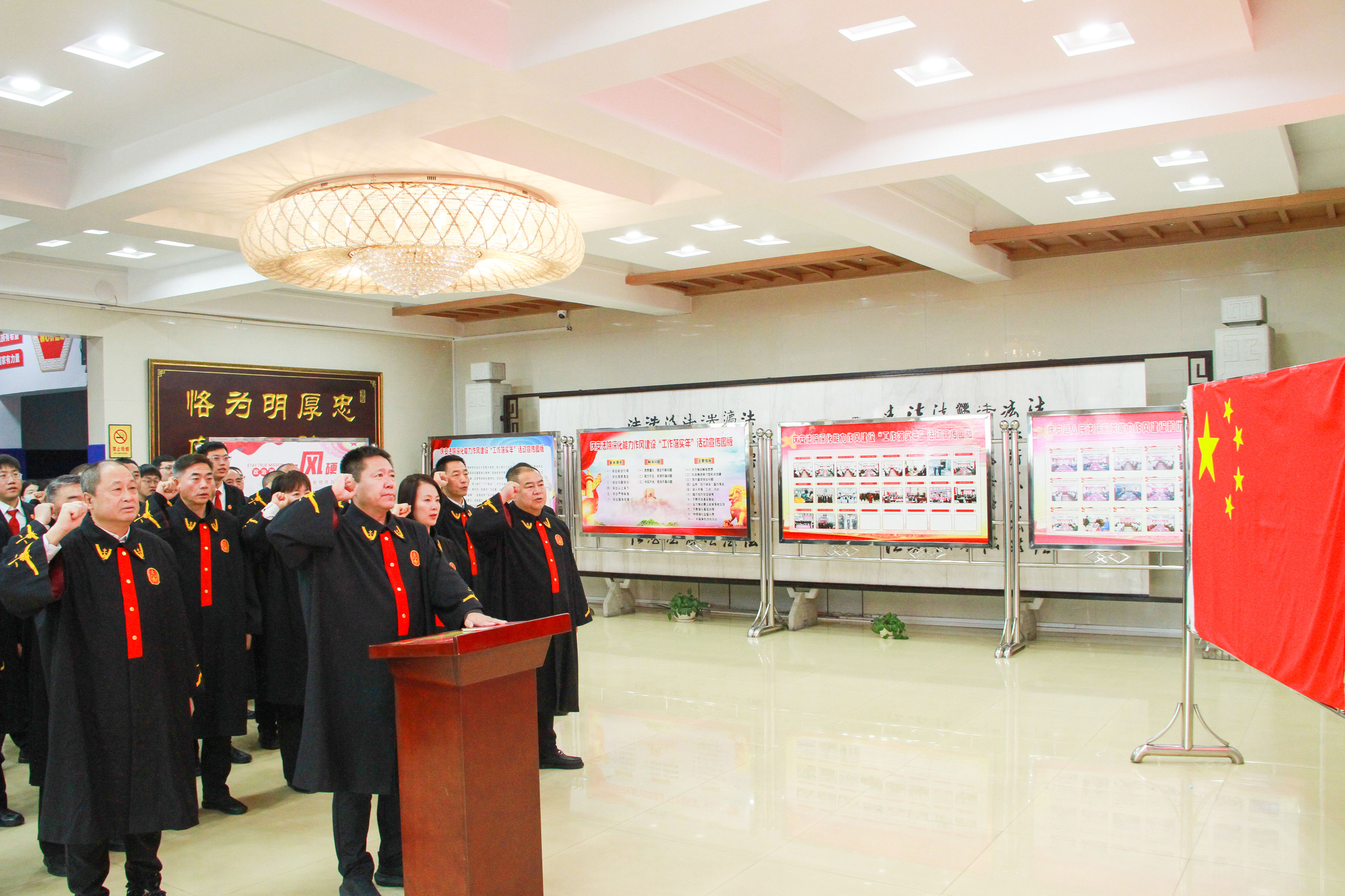 8:00时,在法院办公楼大厅内,党组书记、院长高玉阁领誓,全体干警举起右拳,面向国旗向宪法庄严宣誓:“我宣誓,忠于中华人民共和国宪法,维护宪法权威,履行法定职责,忠于祖国、忠于人民,恪尽职守、廉洁奉公,接受人民监督,为建设富强民主文明和谐美丽的社会主义现代化强国努力奋斗!”