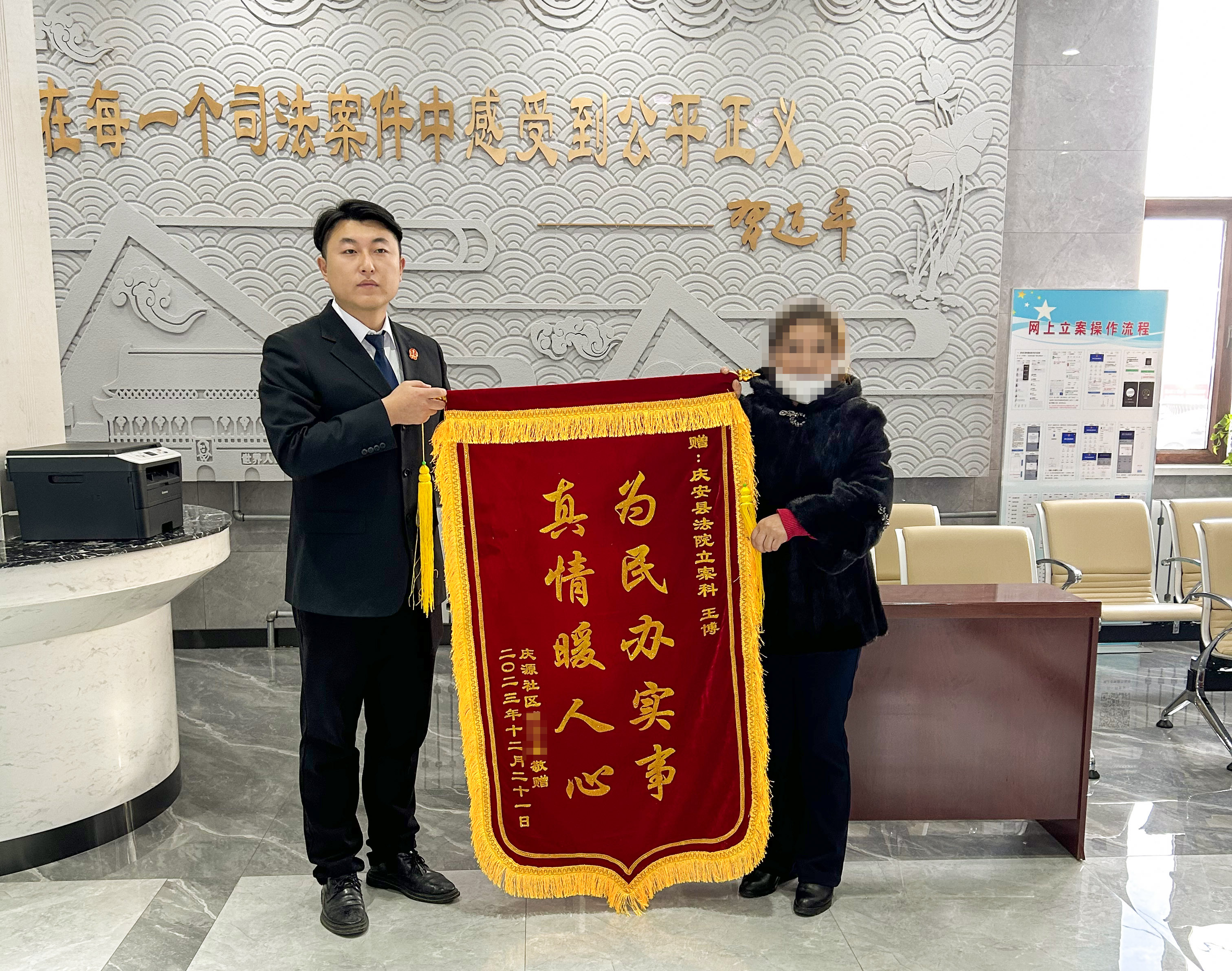 12月27日,钱某给庆安县人民法院立案庭干警王博送来一面印有“为民办实事 真情暖人心”字样的锦旗。一面锦旗,两行言语,道出了钱某对干警尽职尽责、热情服务的高度赞扬和诚挚感谢。