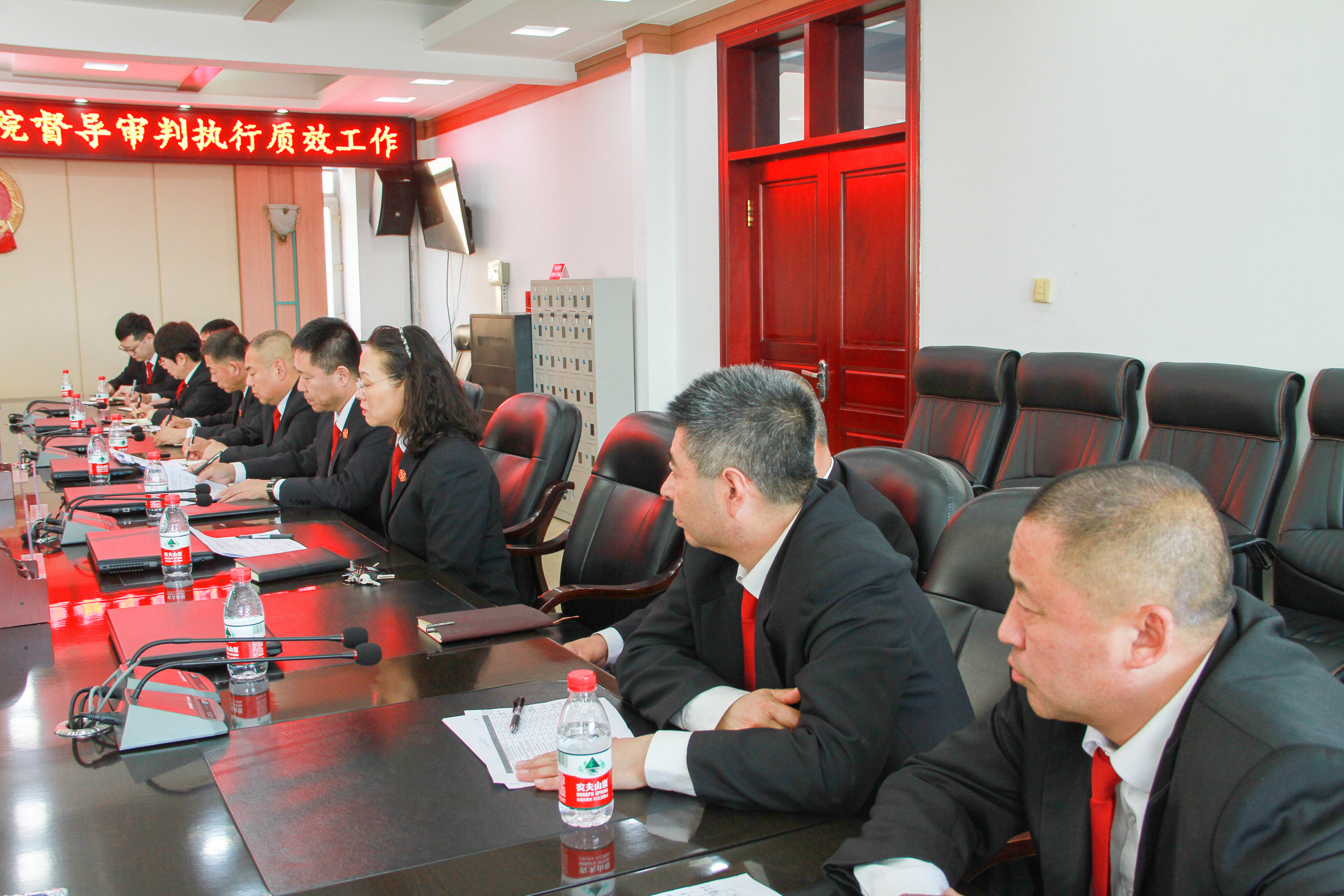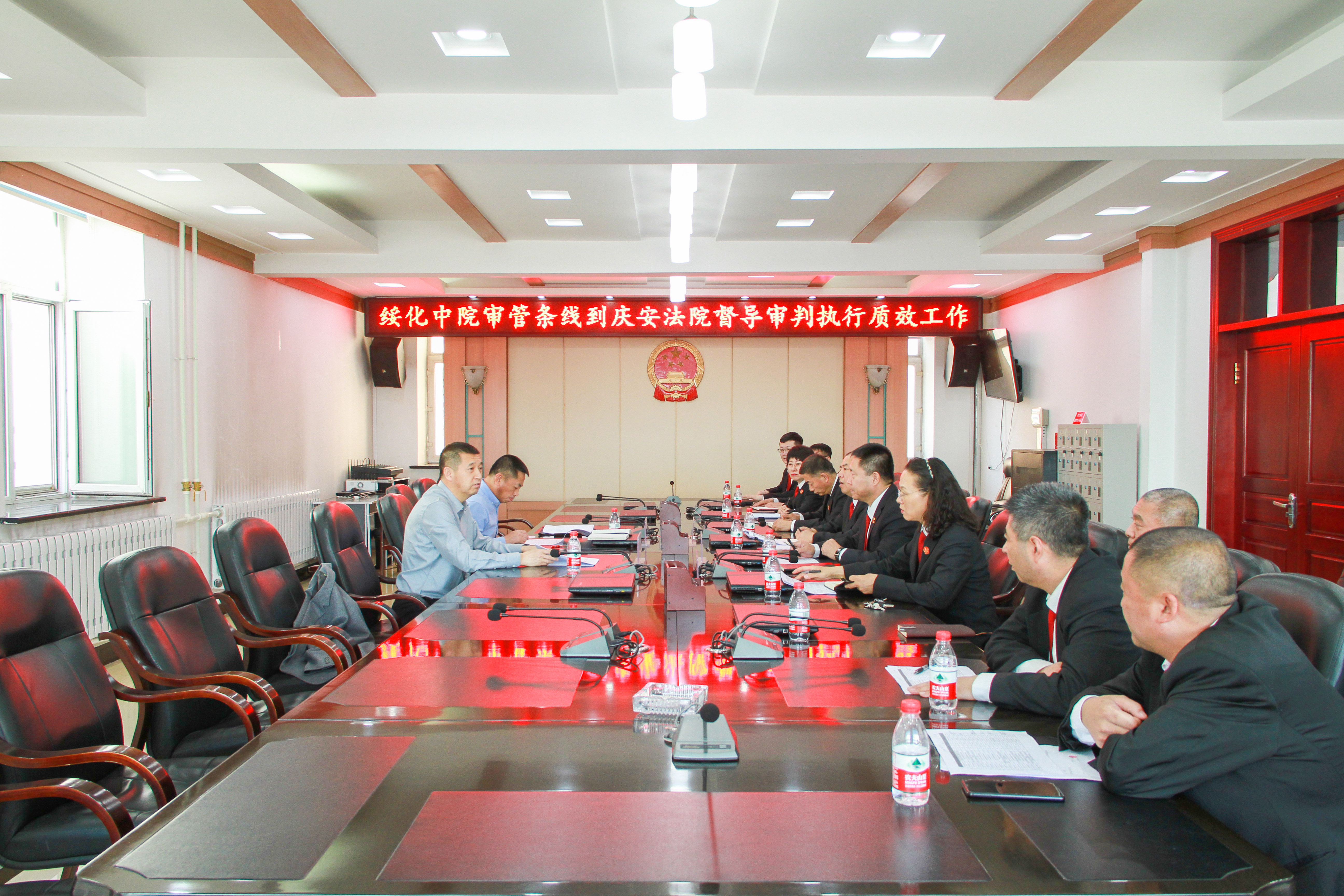 4月17日下午,绥化市中级人民法院党组成员、副院长王铁军、审管办主任刘昕到庆安法院督导审判执行质效工作。庆安法院党组书记、院长高玉阁、其他班子成员及审判业务部门负责人参加了座谈会。