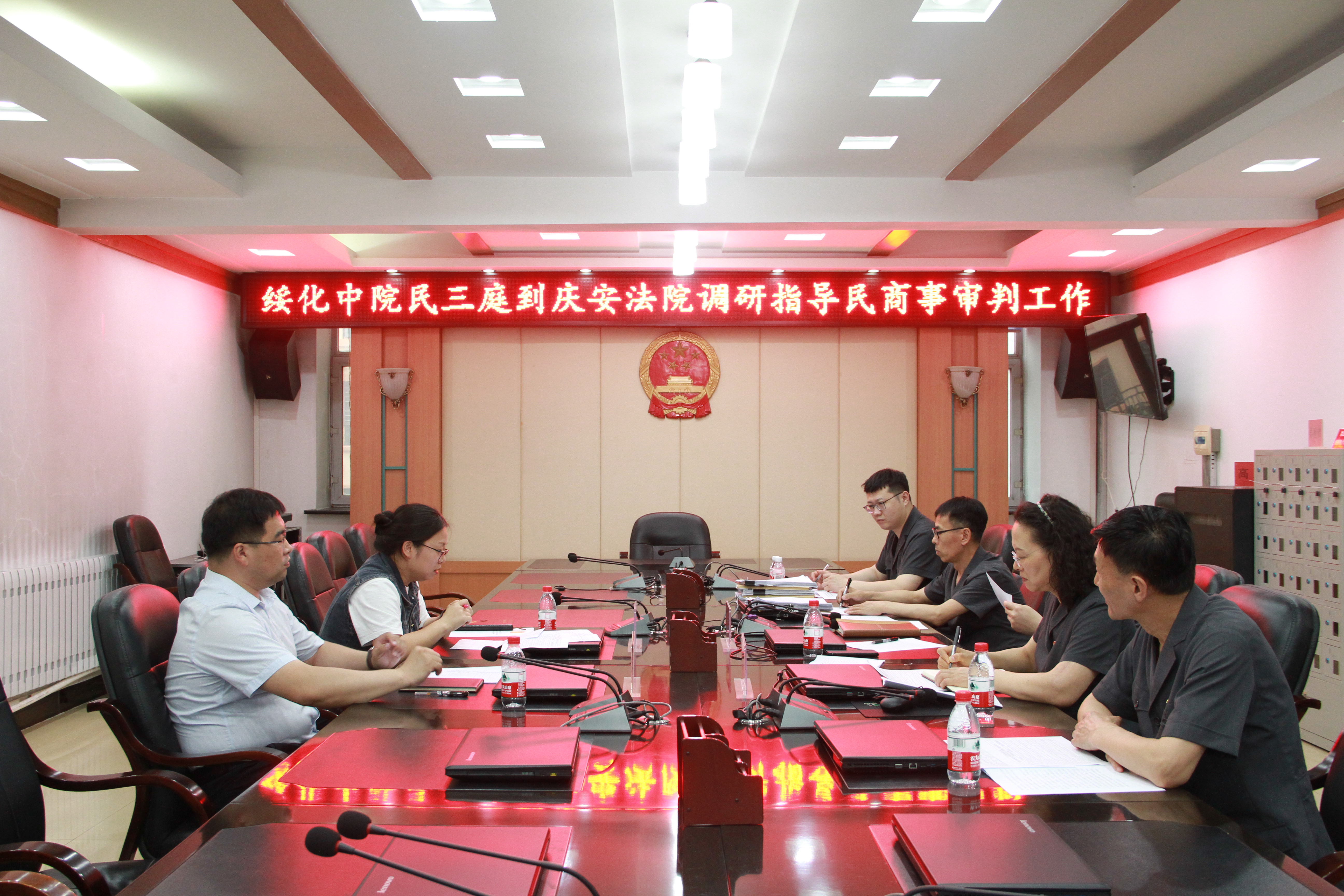 6月20日,绥化市中级人民法院民三庭庭长卢轶楠、副庭长王杨杨到庆安县人民法院调研指导民商事审判工作。庆安法院党组成员、副院长乔永艳、党组成员、副院长于成林、民庭庭长郝树长、民庭员额法官参加了座谈会。