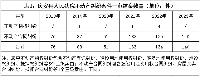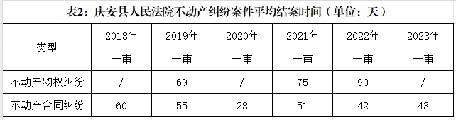 数据显示:2018年至2023年,不动产纠纷案件数量总体上升,一审结案数量由2018年的76件上升至2023年的140件,增幅为84.21%;不动产纠纷案件的审理时间呈下降趋势,当事人的诉讼时间成本不断降低,其中不动产合同纠纷一审案件平均结案时间由2018年的60天下降至2023年的43天。