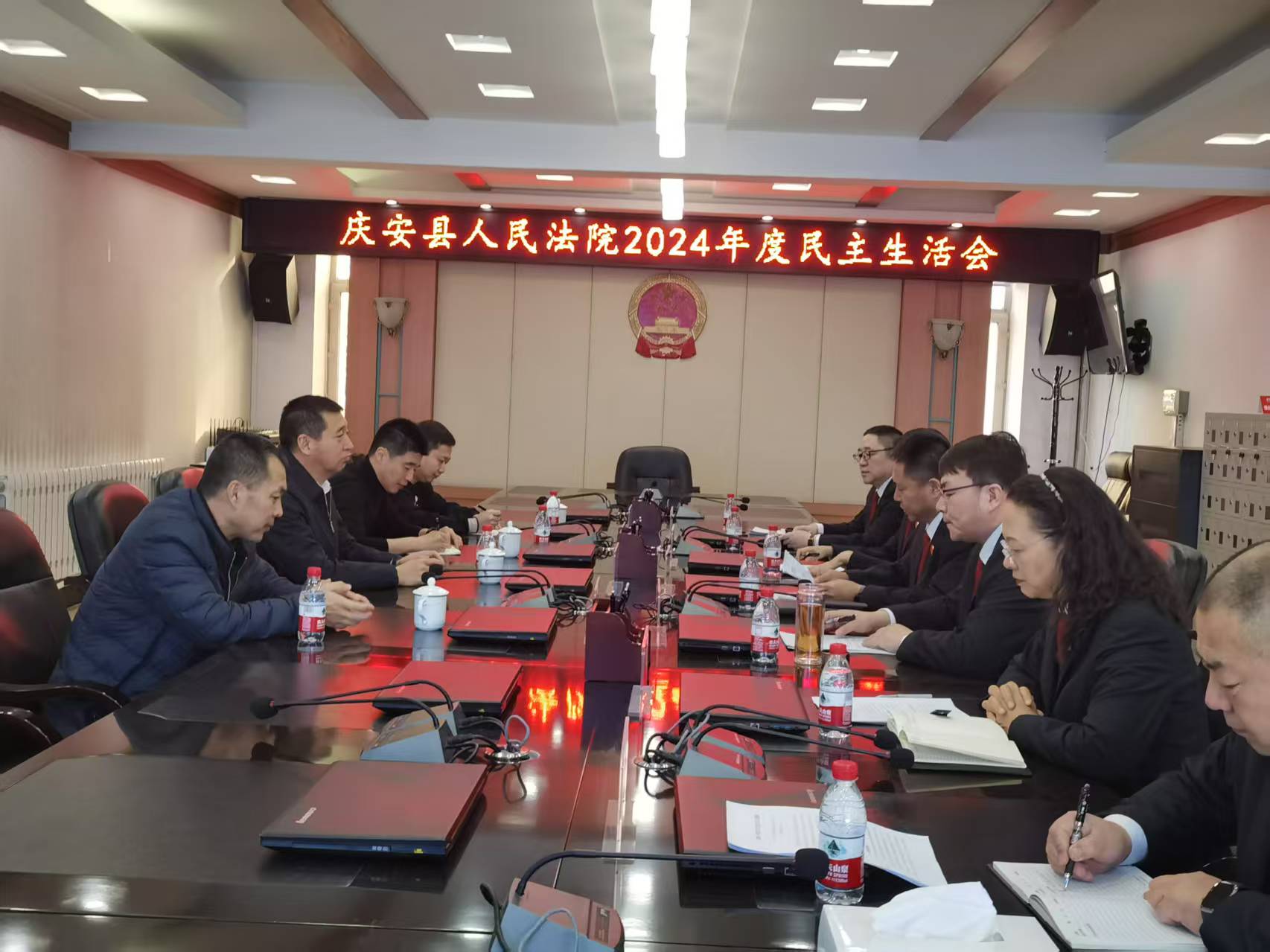 2月8日,庆安县人民法院召开党组班子2024年度民主生活会。会议由党组书记、院长高玉阁主持,其他班子成员参加会议。绥化中院、县委政法委、县委组织部、驻县委政法委纪检监察组相关领导列席会议。